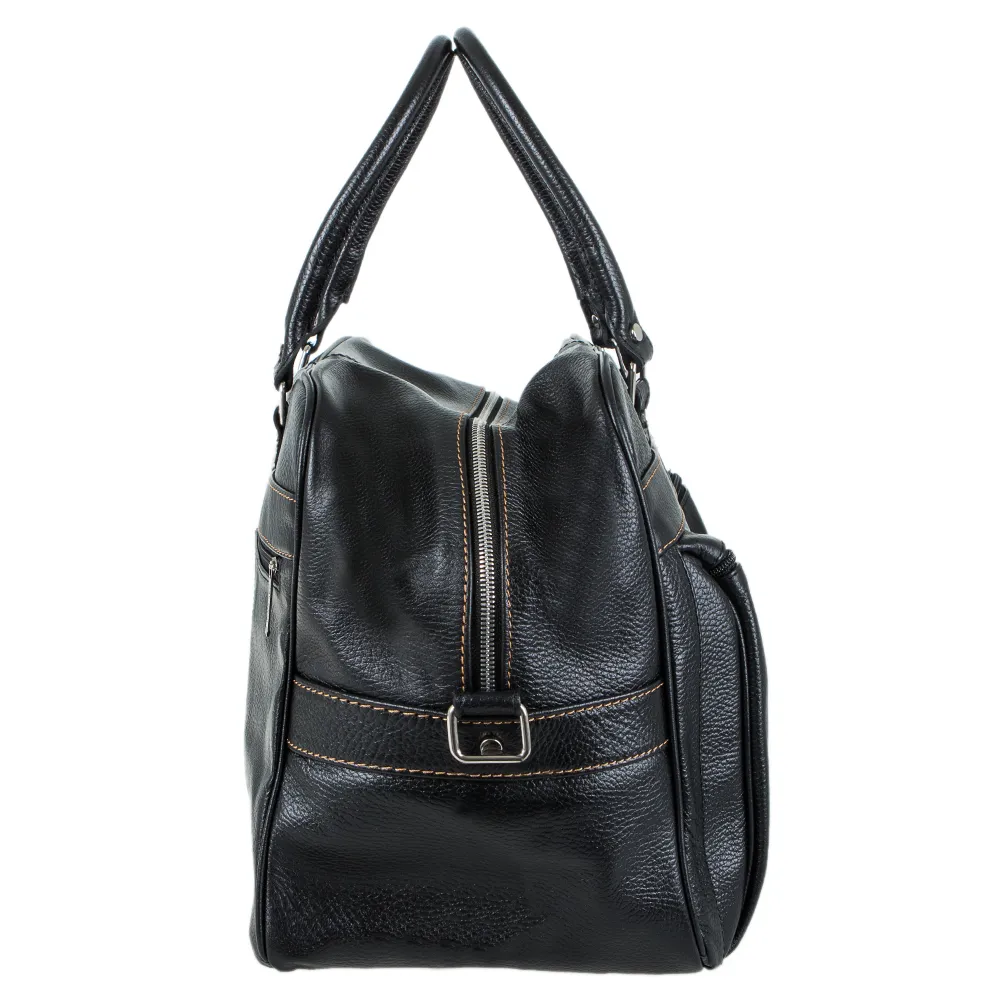 Дорожная сумка от торговой марки Francesco Molinary выполнена из натуральной кожи черного цвета с контрастной отсрочкой. Модель с двумя плотными ручками и съемным регулируемым плечевым ремнем, выполненным из текстильного материала. Отделение на молнии. Внутри: фирменная подкладка, накладной карман. На лицевой и задней сторонах – карман на молнии. Дно оснащено металлическими ножками для защиты от износа. Сумка весом 1,32 кг рассчитана на объем 33,5 литров.