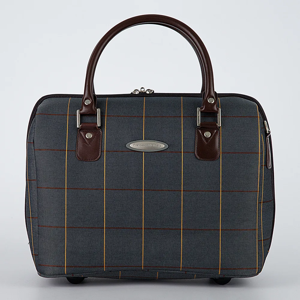 Дорожная сумка от торговой марки Francesco Molinary из плотного текстильного материала синего цвета в красно-белую клетку и искусственной кожи. Модель с двумя ручками и съемным регулируемым плечевым ремнем с наплечником. Отделение на молнии с двумя бегунками, оснащенными «ушками» для навесного замка, не входящего в комплект. Внутри: фирменная подкладка, карман на молнии, накладные карманы. На задней стороне – лямка для крепления на выдвижную ручку чемодана. Дно оснащено пластиковыми ножками для защиты от износа.