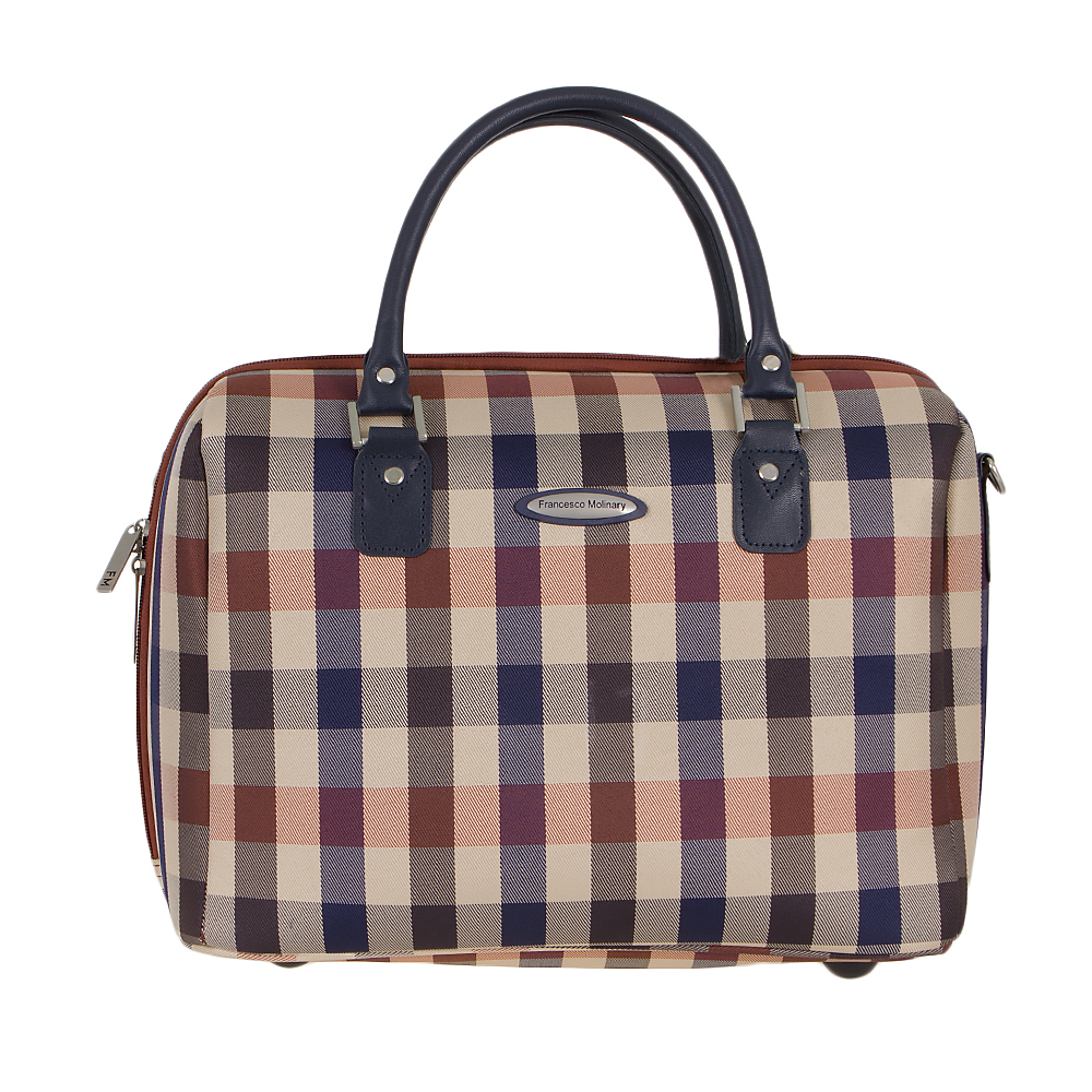 Дорожная сумка от торговой марки Francesco Molinary из плотного текстильного материала синего цвета в красно-белую клетку и искусственной кожи. Модель с двумя ручками и съемным регулируемым плечевым ремнем с наплечником. Отделение на молнии с двумя бегунками, оснащенными «ушками» для навесного замка, не входящего в комплект. Внутри: фирменная подкладка, карман на молнии, накладные карманы. На задней стороне – лямка для крепления на выдвижную ручку чемодана. Дно оснащено пластиковыми ножками для защиты от износа.