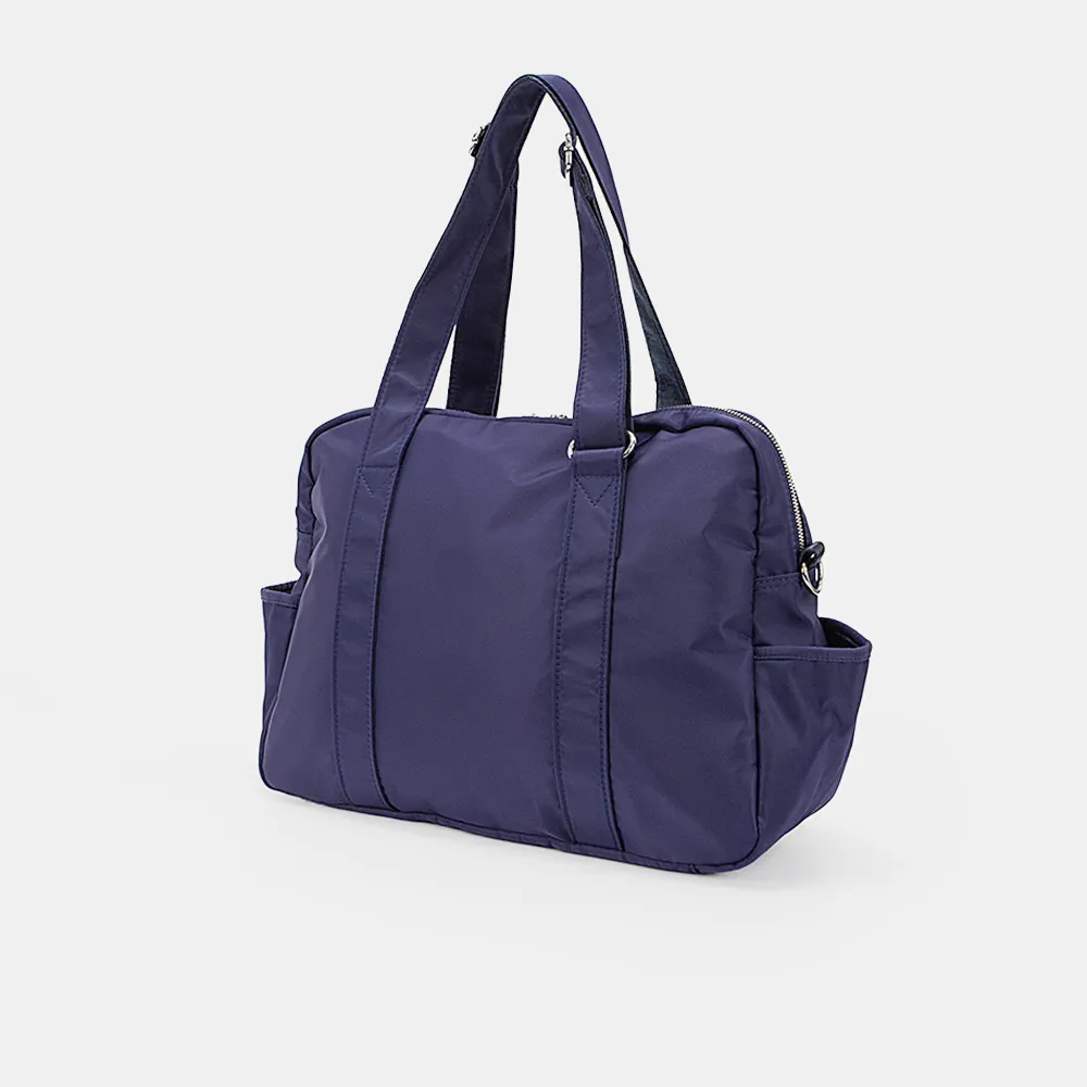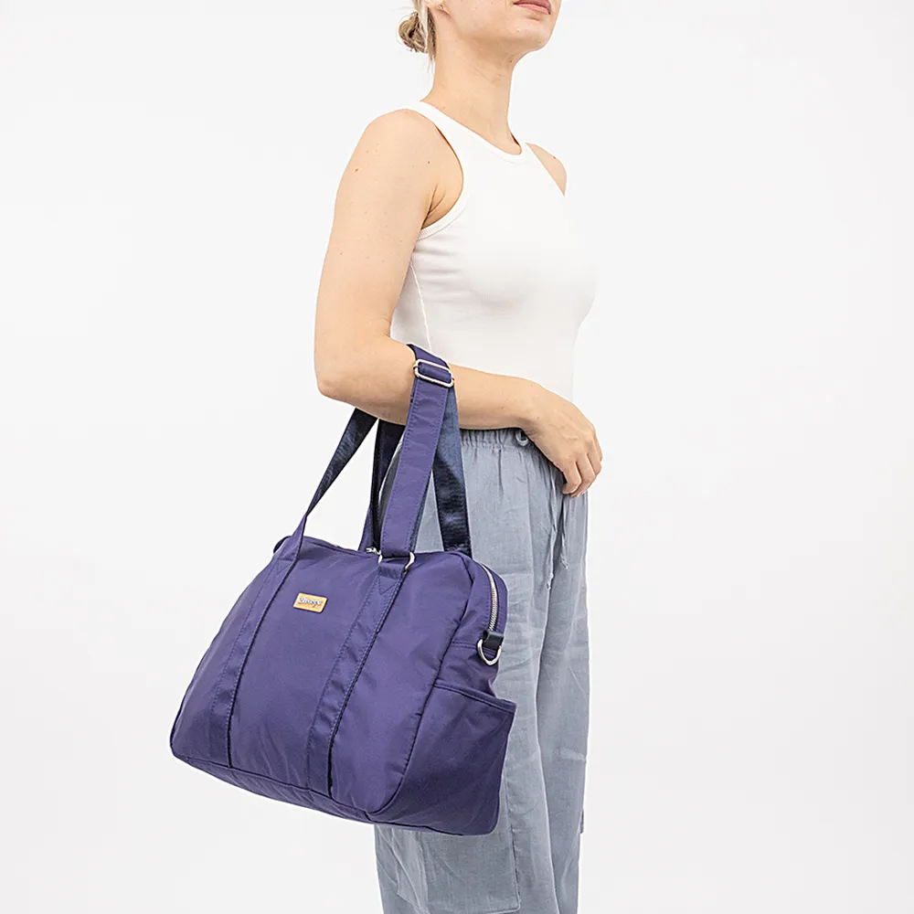 Невероятно лёгкая дорожная сумка Ecotope выполнена из текстильного материала синего цвета с металлической фурнитурой. Помещается в ручную кладь. Имеет две ручки для переноски, которые регулируются по длине и плечевой ремень в комплекте. Застёгивается на молнию, внутри текстильная подкладка и семь карманов. Снаружи два боковых кармана без застёжек.