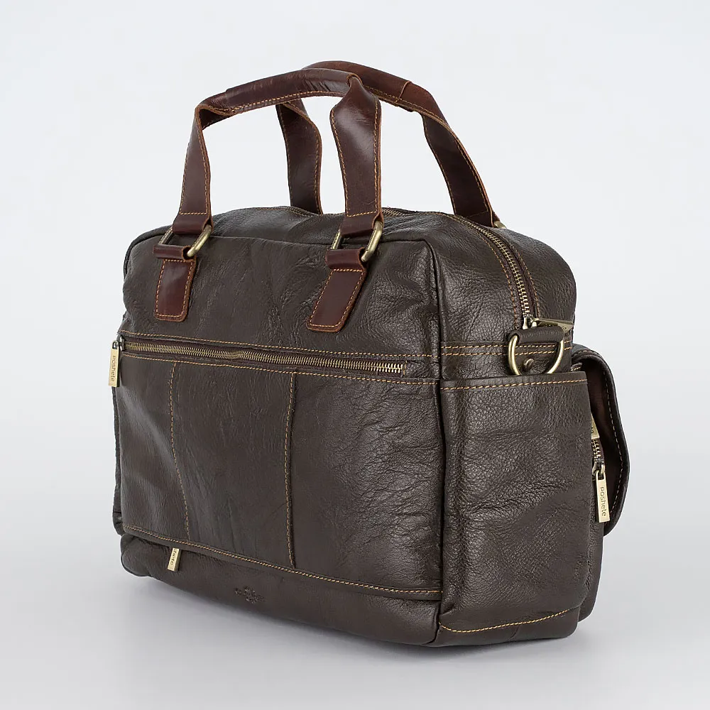 Стильная дорожная сумка для делового образа от бренда Poshete выполнена из натуральной кожи коричневого цвета. Модель прямоугольной формы, с плотной ручкой на кольцах-держателях и широким съемным плечевым ремнем. Вместительное отделение на молнии, с текстильной подкладкой. Внутри: карман на молнии, накладной карман для ноутбука, закрывающийся хлястиком на кнопку. На передней стороне – накладной карман с клапаном на двух магнитных кнопках. Клапан, декорированный вставками более яркого оттенка и нашивкой с эмблемой и названием бренда, также закрывает карман на молнии и два накладных кармана на молнии. По бокам сумки – карманы на магнитной кнопке. На задней стороне – карман на молнии по всей длине сумки, снизу имеется молния, благодаря которой карман превращается в плечевую лямку для фиксации на ручку чемодана. Молнии с кожаными пуллерами. Сумка декорирована контрастной отстрочкой.