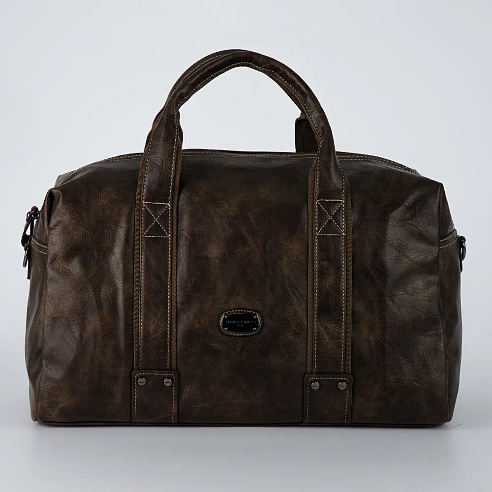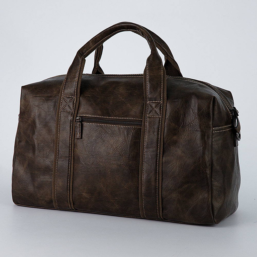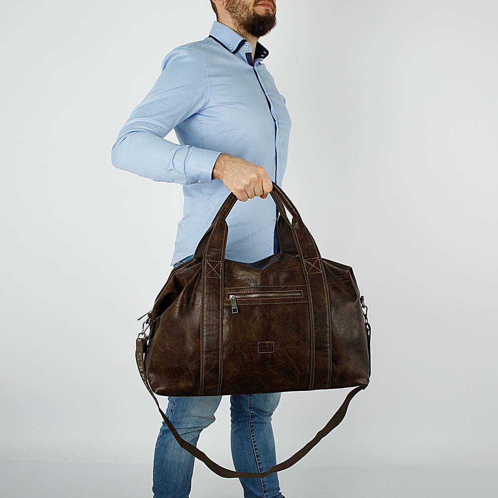 Дорожная сумка от торговой марки David Jones из искусственной кожи коричневого цвета. Модель с двумя ручками и съемным плечевым ремнем. Отделение на молнии. Внутри: фирменная подкладка, карман на молнии два накладных кармана. На задней стороне – карман на молнии.