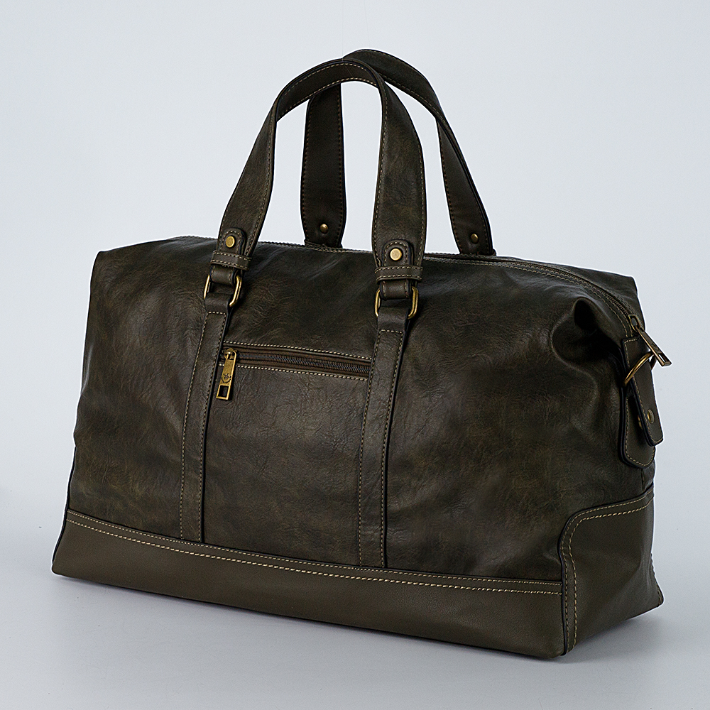 Вместительная дорожная сумка от бренда David Jones в ретро стиле, выполнена из искусственной кожи в серо-зеленом цвете и декорирована светлой строчкой. Модель с одним текстильным отделением под металлической молнией. Внутри два накладных кармана без застежек и прорезной карман на молнии. Снаружи две короткие ручки и три прорезных кармана на молниях. В комплекте есть плечевой ремень.