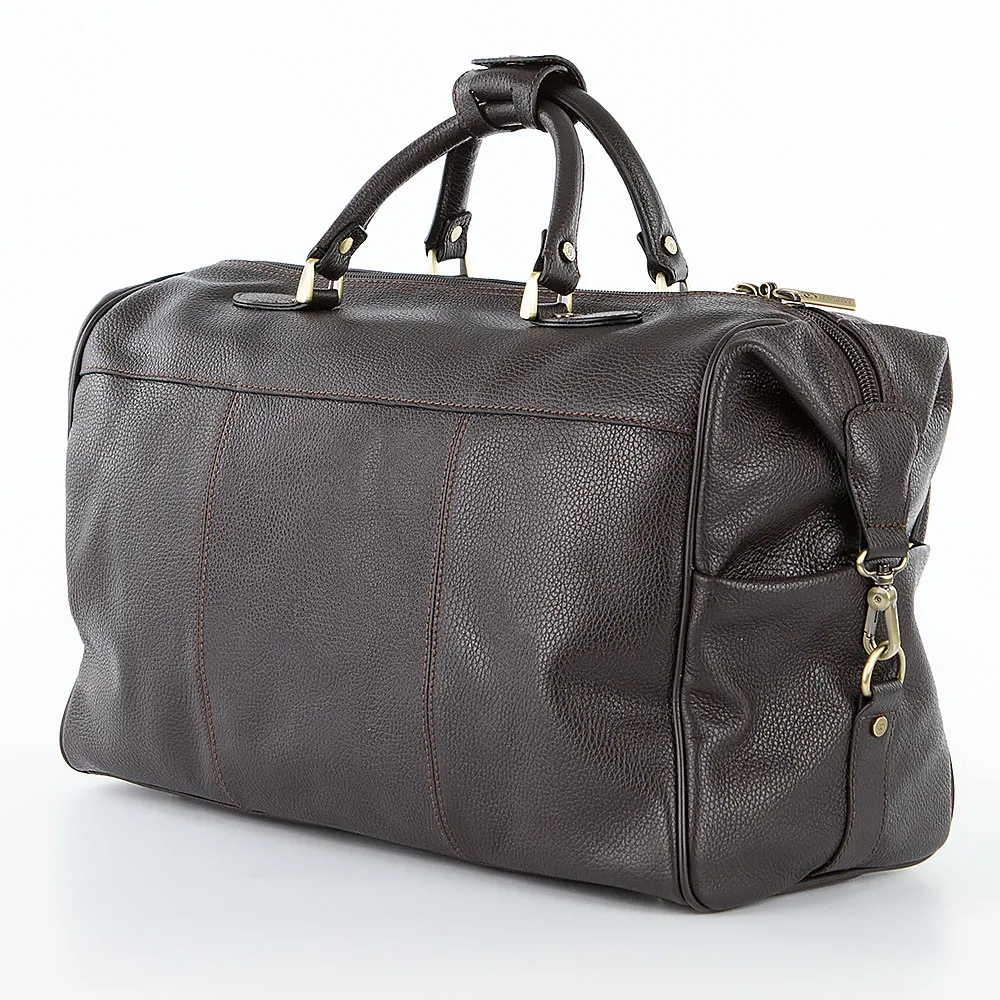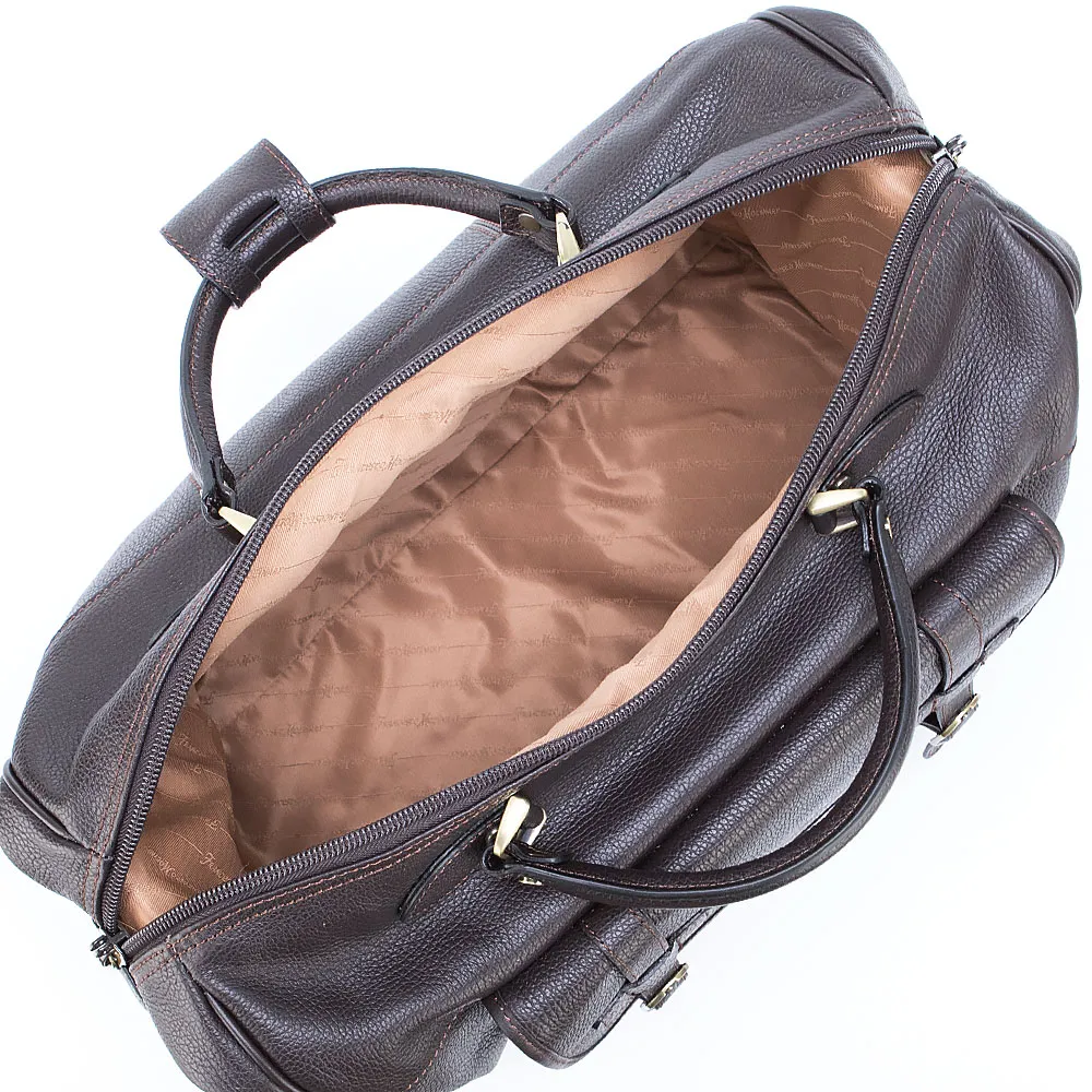 Дорожная сумка от торговой марки Francesco Molinary из натуральной кожи коричневого цвета. Модель с двумя ручками с фиксатором на кнопке и съемным регулируемым плечевым ремнем. Отделение на молнии, которая фиксируется по бокам карабином. Внутри: фирменная подкладка, карман на молнии. На лицевой стороне – вместительный накладной карман с клапаном, декорированным ремешками с пряжками. По бокам – накладной карман. Дно оснащено ножками для защиты от износа.
