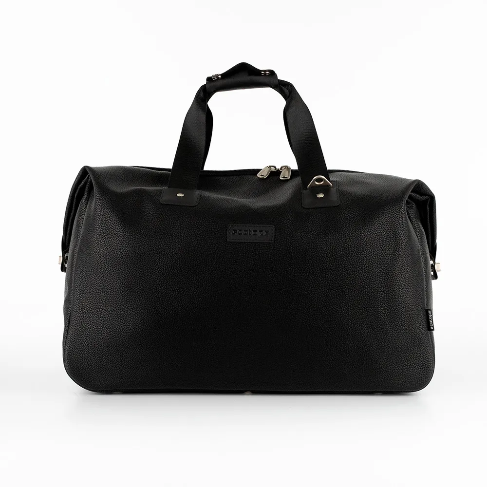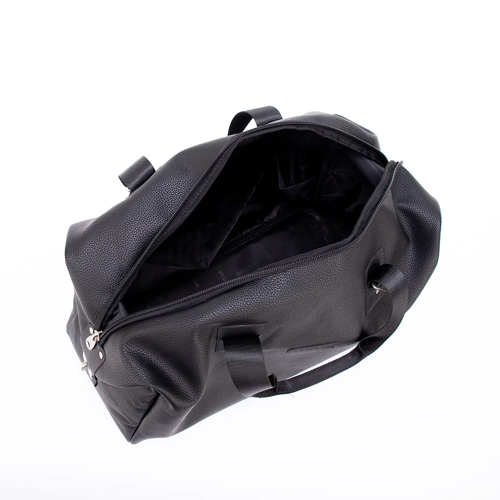 Дорожно-спортивная сумка от торговой марки Ecotope из искусственной кожи черного цвета. Вместительная модель с двумя ручками с фиксатором на кнопках. Отделение на молнии. Внутри: частичная подкладка, два накладных кармана. Края сумки крепятся по бокам поворотным замком, за счет чего меняется форма и объем сумки. На задней стороне – карман на молнии. Дно оснащено ножками для защиты от износа.