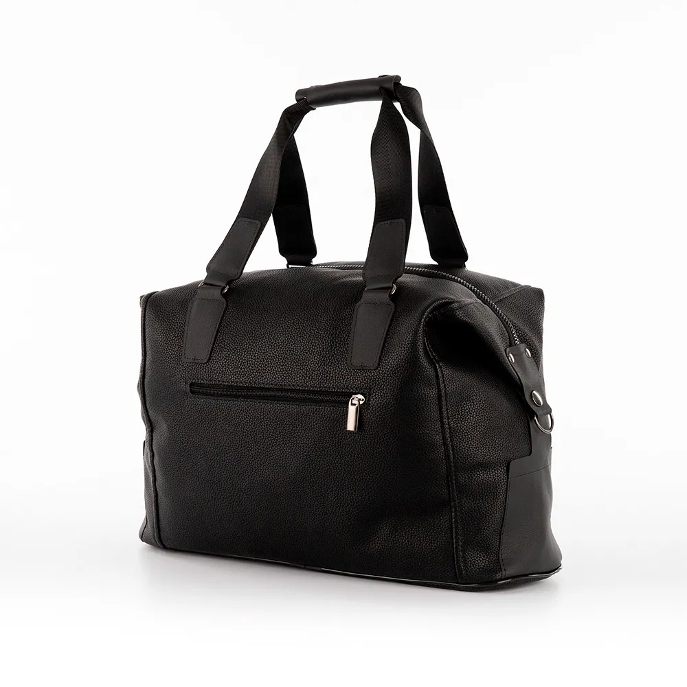 Дорожно-спортивная сумка от торговой марки Ecotope из искусственной кожи черного цвета. Вместительная модель с двумя ручками с фиксатором на кнопке и съемным регулируемым плечевым ремнем. Отделение на молнии. Внутри: частичная подкладка, накладной карман. На лицевой стороне – вертикальный карман на молнии. На задней стороне – карман на молнии. Дно сумки оснащено металлическими ножками для защиты от износа.