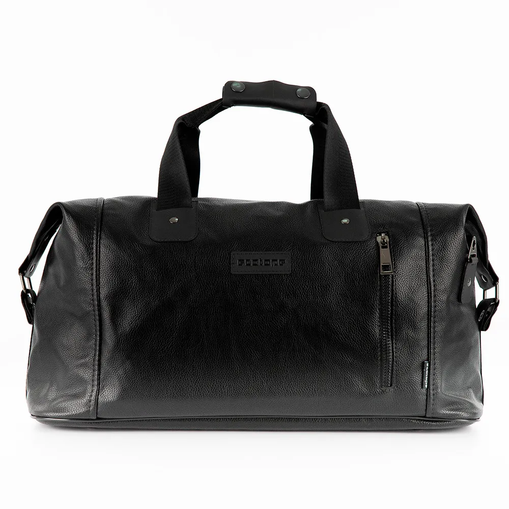 Дорожно-спортивная сумка от торговой марки Ecotope из искусственной кожи черного цвета. Модель с двумя ручками с фиксатором на кнопках и съемным регулируемым плечевым ремнем. Отделение на молнии. Внутри: текстильная подкладка, накладной карман. На лицевой и задней сторонах – карман на молнии. Дно оснащено ножками для защиты от износа.