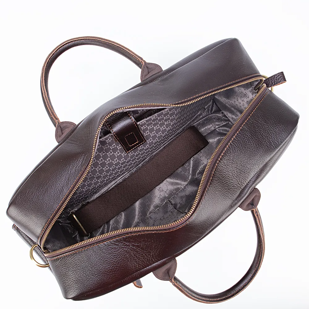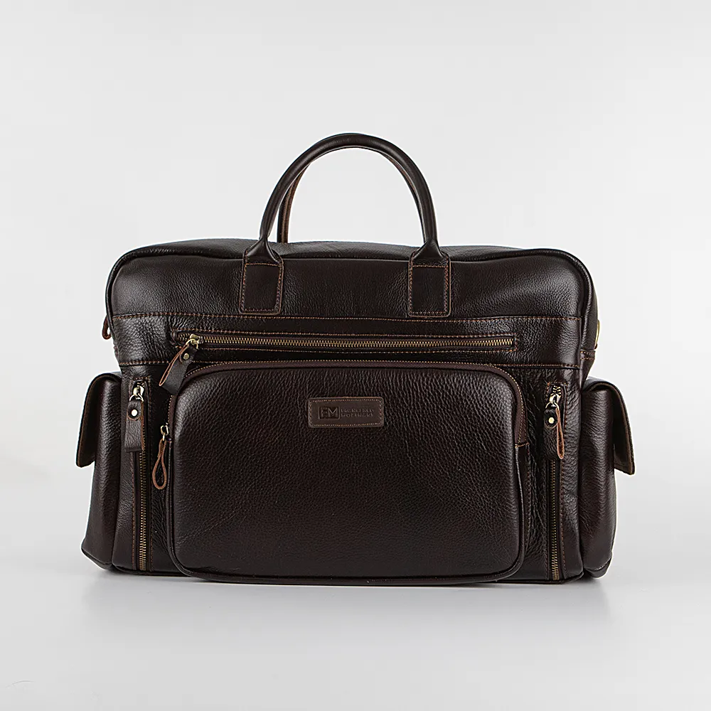 Дорожно-спортивная сумка от торговой марки Francesco Molinary из натуральной кожи коричневого цвета. Компактная функциональная модель с двумя плотными ручками и съемным регулируемым плечевым ремнем. Отделение на молнии. Внутри: фирменная подкладка, накладной карман с уплотненной стенкой для ноутбука, карман на молнии, два накладных кармана. На лицевой стороне – четыре кармана на молнии. По бокам – накладной карман с клапаном на кнопке. На задней стороне – вместительный карман на молнии.