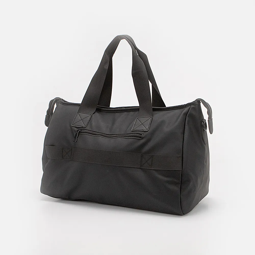 Дорожно-спортивная сумка от торговой марки Valigetti из практичного текстильного материала черного цвета с водоотталкивающей пропиткой. Модель с удлиненными ручками и съемным регулируемым плечевым ремнем. Отделение на молнии. Внутри: текстильная подкладка, карман на молнии, два накладных кармана. На лицевой и задней сторонах – карман на молнии; сзади имеется лямка для крепления на выдвижную ручку чемодана.