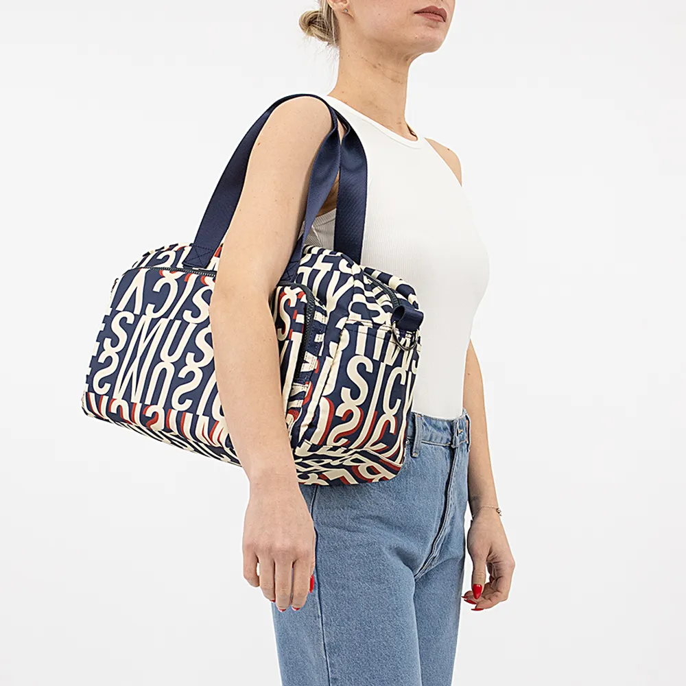 Дорожно-спортивная сумка от торговой марки Valigetti из практичного материала с глянцевым блеском и оригинальным текстовым принтом. Модель с двумя удлиненными ручками и съемным регулируемым плечевым ремнем. Отделение на молнии. Внутри: текстильная подкладка, карман на молнии, два накладных кармана. На лицевой стороне – карман на молнии. На задней стороне – карман на молнии, лямка для фиксации на выдвижную ручку чемодана. Стенки уплотненные. Молодежная текстильная коллекция представлена моделями, выполненными из трех видов материалов: прочной ткани рип-стоп, блестящего и матового текстиля. Фурнитура повышенной прочности обеспечивает плавность движения замка и долговечность использования.
