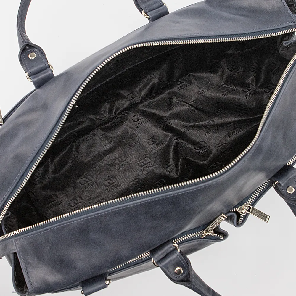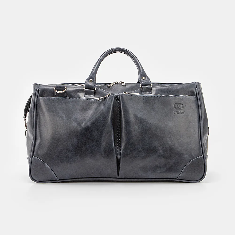 Дорожно-спортивная сумка от торговой марки Francesco Molinary из натуральной кожи синего цвета. Модель с двумя плотными ручками, съемным регулируемым плечевым ремнем. Отделение на молнии. Внутри: фирменная подкладка, карман на молнии, два накладных кармана. На лицевой стороне – два кармана на молнии. На задней стороне – карман на молнии. Дно оснащено металлическими ножками для защиты от износа.