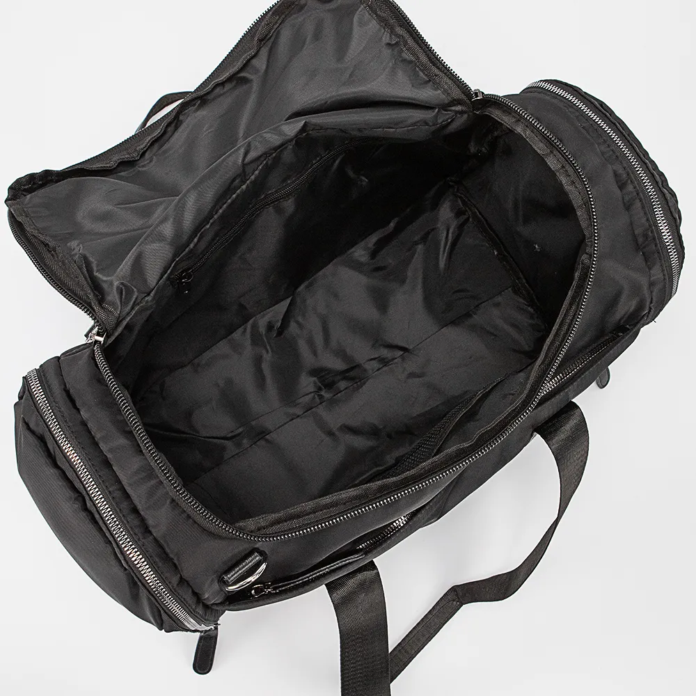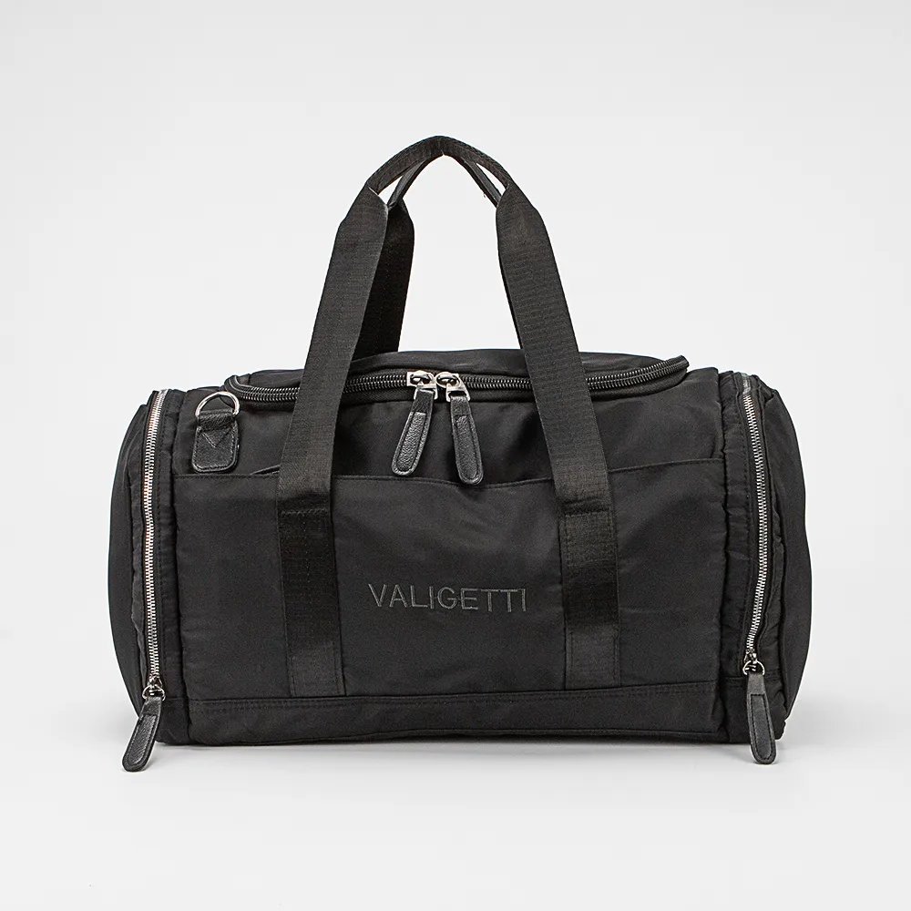 Дорожно-спортивная сумка от торговой марки Valigetti из практичного текстильного материала черного цвета. Модель с двумя ручками и съемным регулируемым плечевым ремнем. Закрывается клапаном на молнии. Внутри: текстильная подкладка, карман на молнии, три накладниых сетчатых кармана. На лицевой стороне – водонепроницаемый карман на молнии. На задней стороне – лямка для крепления на выдвижную ручку чемодана. По бокам – карман на молнии. Дно оснащено прорезиненными накладками для защиты от износа.