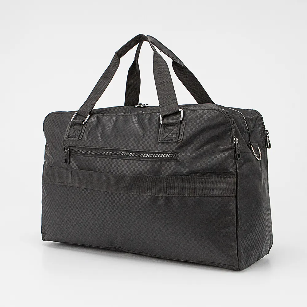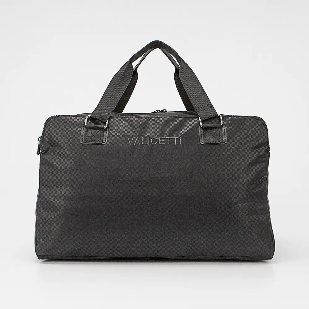 Дорожно-спортивная сумка от торговой марки Valigetti из практичного текстильного материала с шахматным рисунком и искусственной кожи . Модель с двумя ручками и съемным регулируемым плечевым ремнем. Три отделения на молнии. Внутри: текстильная подкладка. На задней стороне – карман на молнии, лямка для крепления на выдвижную ручку чемодана. Дно оснащено круглыми пластиковыми ножками для защиты от износа.