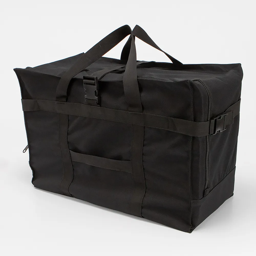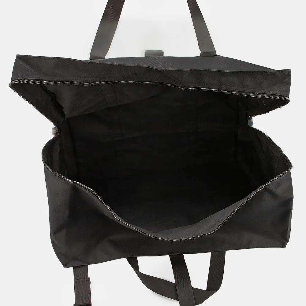 Дорожно-спортивная сумка из практичного плотного текстильного материала черного цвета. Объемная вместительная модель с двумя ручками. Отделение на молнии с дополнительными ремнями для фиксации на застежке фастекс. На задней стороне - лямка для фиксации на выдвижную ручку чемодана.