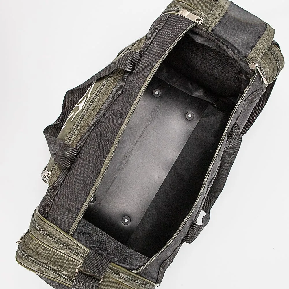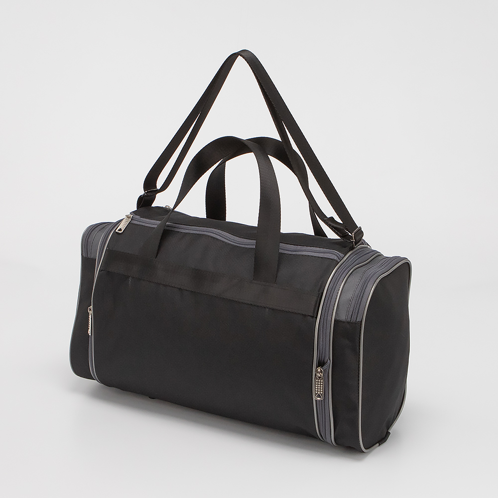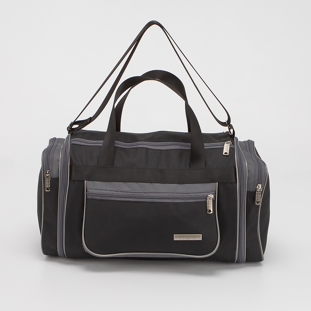 Дорожно-спортивная сумка от торговой марки Mr.Bag из практичного текстильного материала. Модель с двумя ручками, регулируемым плечевым ремнем. Отделение закрывается клапаном с двумя молниями. Внутри: без подкладки. На лицевой стороне, декорированной принтом, – карман на молнии. По бокам имеется карман на молнии. Дно оснащено пластиковыми ножками для защиты от износа.