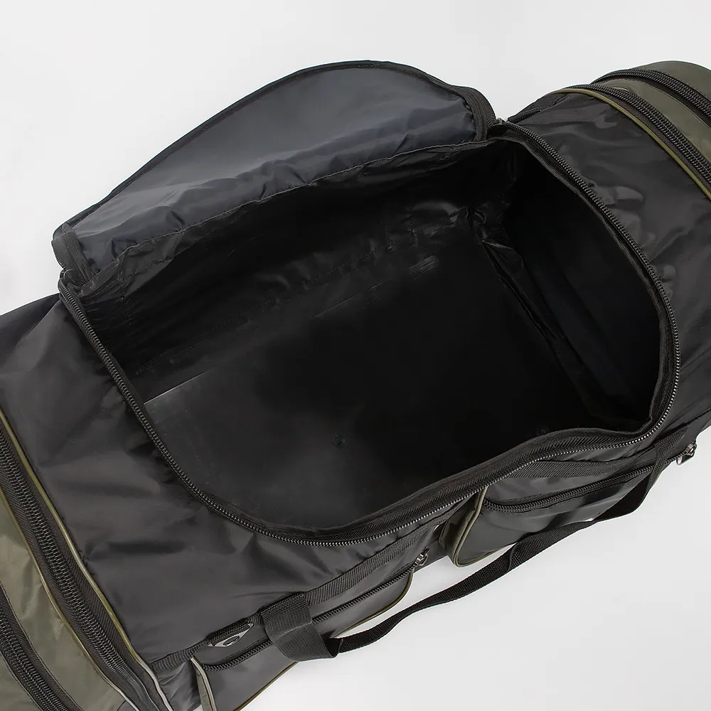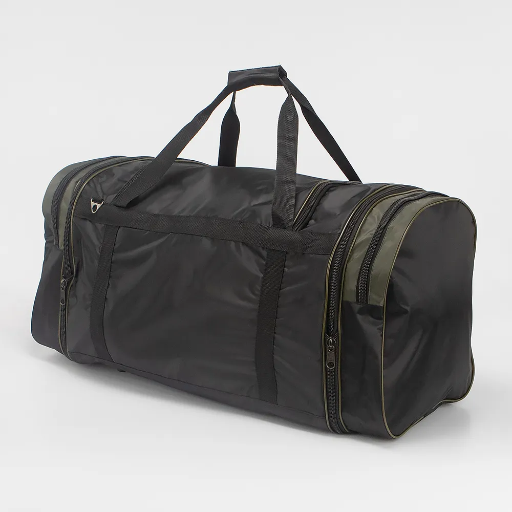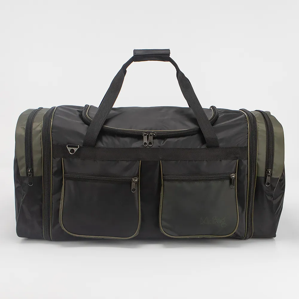 Спортивно-дорожная сумка от Mr.Bag выполнена из плотного текстильного материала в сочетании черного цвета и хаки. Модель прямоугольной формы, с двумя удлиненными ручками с фиксатором на липучке и съемным плечевым ремнем. Отделение закрывается клапаном на молнии, без подкладки. По бокам-карман на молнии и раздвижка для увеличения объема сумки. На передней стороне-два кармана на молнии.