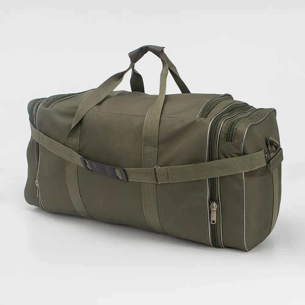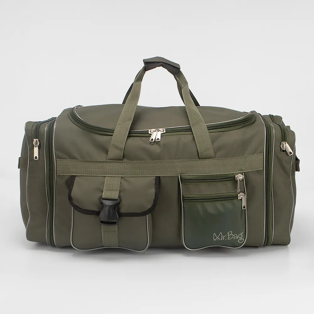 Спортивно-дорожная сумка от Mr.Bag выполнена из плотного текстильного материала цвета хаки. Модель прямоугольной формы, с двумя удлиненными ручками с фиксатором на липучке и съемным плечевым ремнем с резиновым наплечником. Отделение закрывается клапаном на молнии, без подкладки. По бокам-карман на молнии и раздвижка для увеличения объема сумки. На передней стороне-два кармана на молнии и накладной карман с клапаном на застежке фастекс. Дно оснащено пластиковыми ножками для защиты от износа.