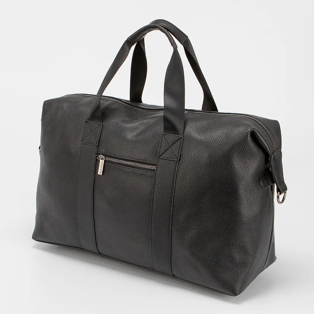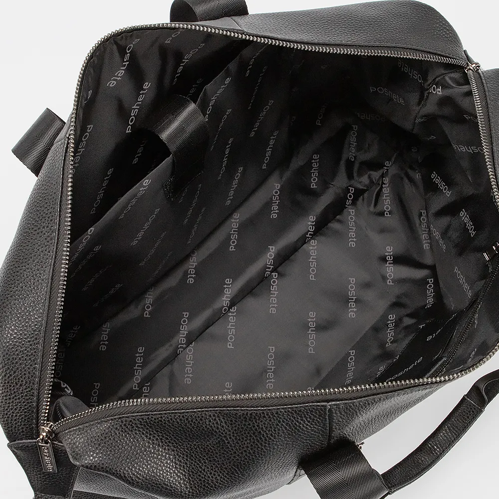 Классическая дорожная сумка для делового образа от бренда Poshete выполнена из натуральной кожи черного цвета. Модель прямоугольной формы, с плотной ручкой и широким съемным плечевым ремнем. Вместительное отделение на молнии, с текстильной подкладкой. Внутри: карман на молнии, накладной карман для ноутбука, закрывающийся хлястиком на липучку. На задней стороне - небольшой карман на молнии. Молнии с металлическими пуллерами. Дно оснащено ножками для защиты от износа.