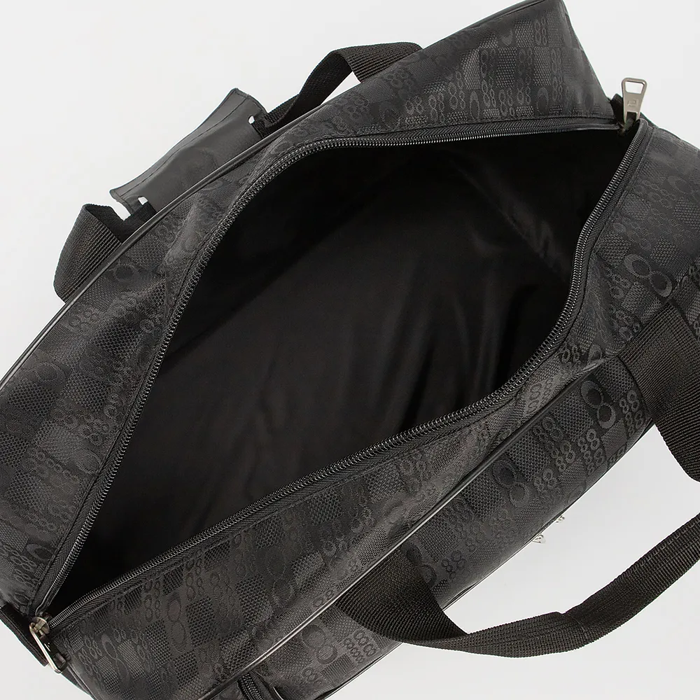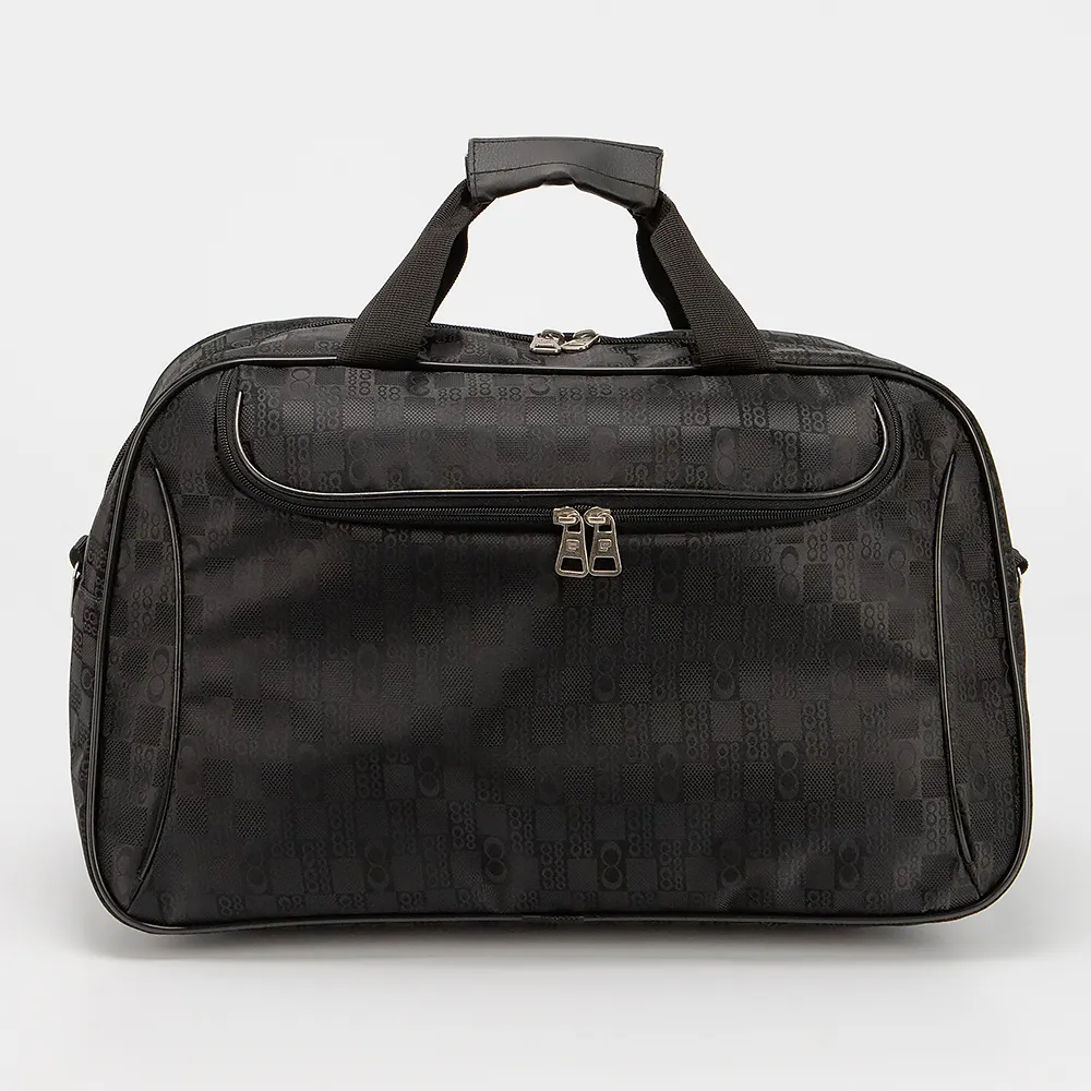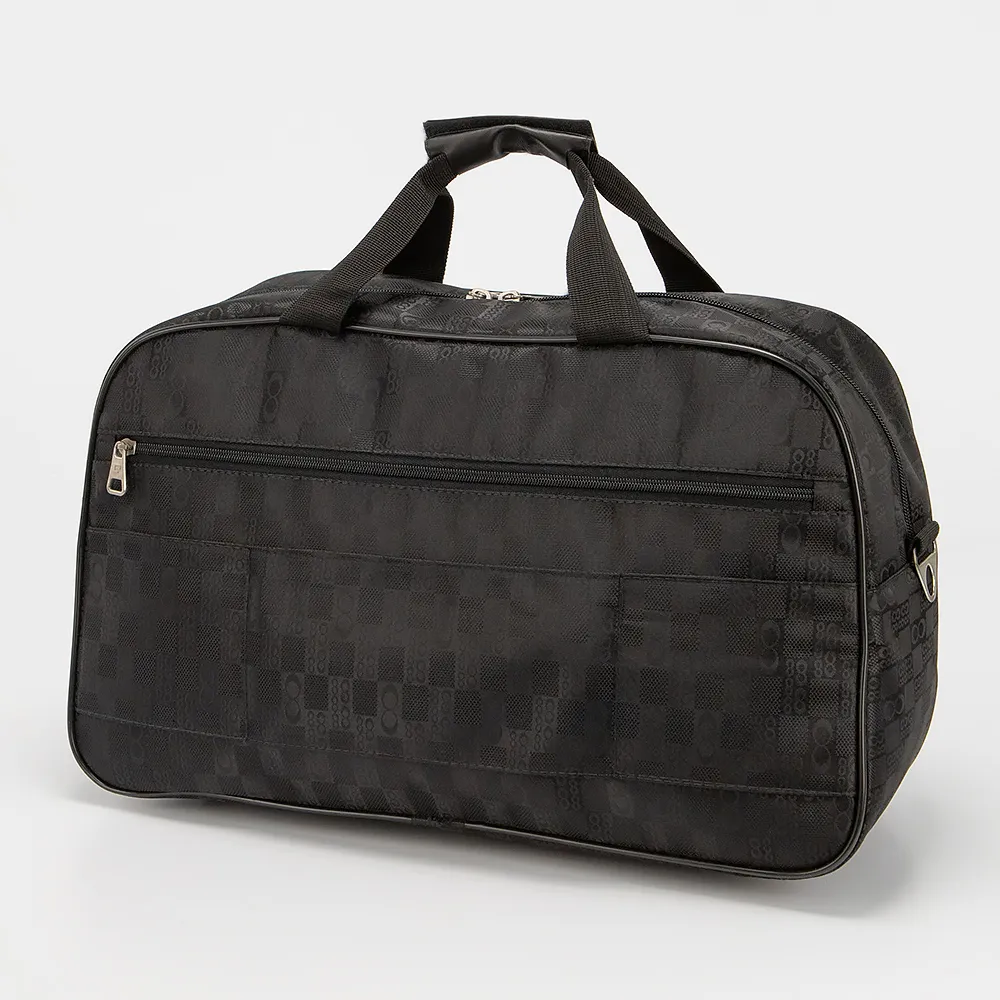 Дорожно-спортивная сумка от торговой марки Ecotope из плотного текстильного материала черного цвета. Вместительная модель с двумя ручками с фиксатором на липучке и съемным плечевым ремнем с наплечником. Отделение на молнии с двумя встречными бегунками. На лицевой и на задней стороне - карман на молнии. Дно оснащено пластиковыми ножками для защиты от износа.