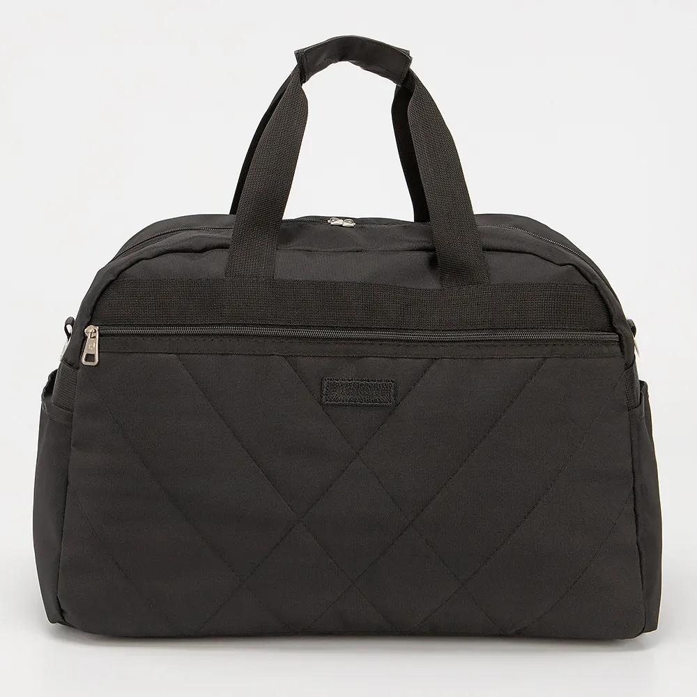Дорожно-спортивная сумка от торговой марки Ecotope из плотного текстильного материала черного цвета. Вместительная модель с двумя ручками с фиксатором на липучке и съемным плечевым ремнем с наплечником. Лицевая сторона декорирована стежкой. Отделение на молнии с двумя встречными бегунками. Внутри: текстильная подкладка, карман на молнии, накладной карман. На лицевой и задней стороне - накладной карман на молнии. По бокам - накладные карманы без застежки.