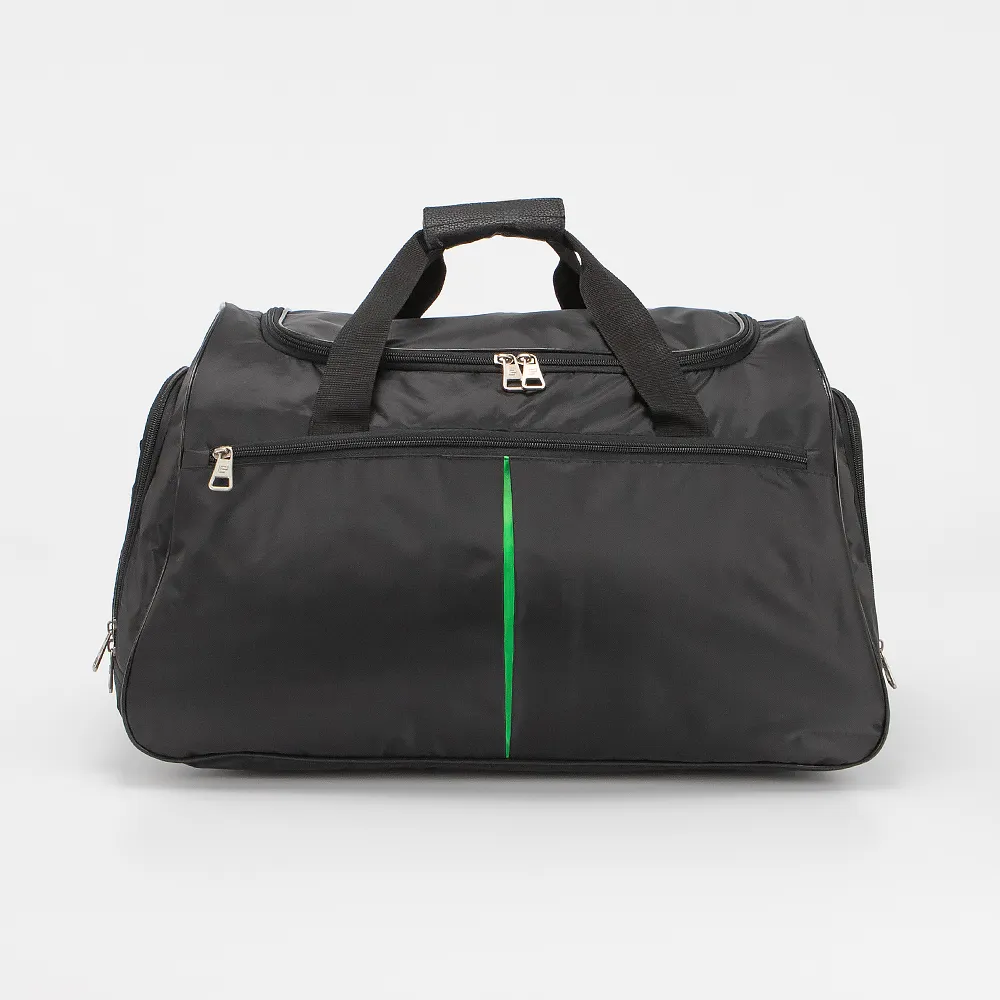 Дорожно-спортивная сумка от торговой марки Ecotope из текстильного материала черного цвета с элементами ярко-зеленого цвета. Модель с двумя ручками с фиксатором на липучке, съемным плечевым ремнем. Клапан на молнии со встречными бегунками закрывает вместительное отделение. Внутри: текстильная подкладка, накладные карманы. По бокам - карман-сетка и карман на молнии. На лицевой стороне - карман на молнии. Дно оснащено пластиковыми ножками для защиты от износа.