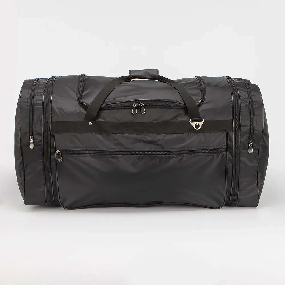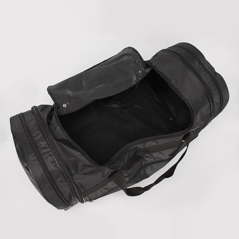 Дорожно-спортивная сумка от торговой марки Ecotope из текстильного материала черного цвета. Модель с двумя ручками с фиксатором на липучке, съемным плечевым ремнем. Клапан на молнии со встречными бегунками закрывает вместительное отделение. По бокам - карманы на молнии. На лицевой стороне - карман на молнии. По бокам имеется молния для увеличения объема сумки.