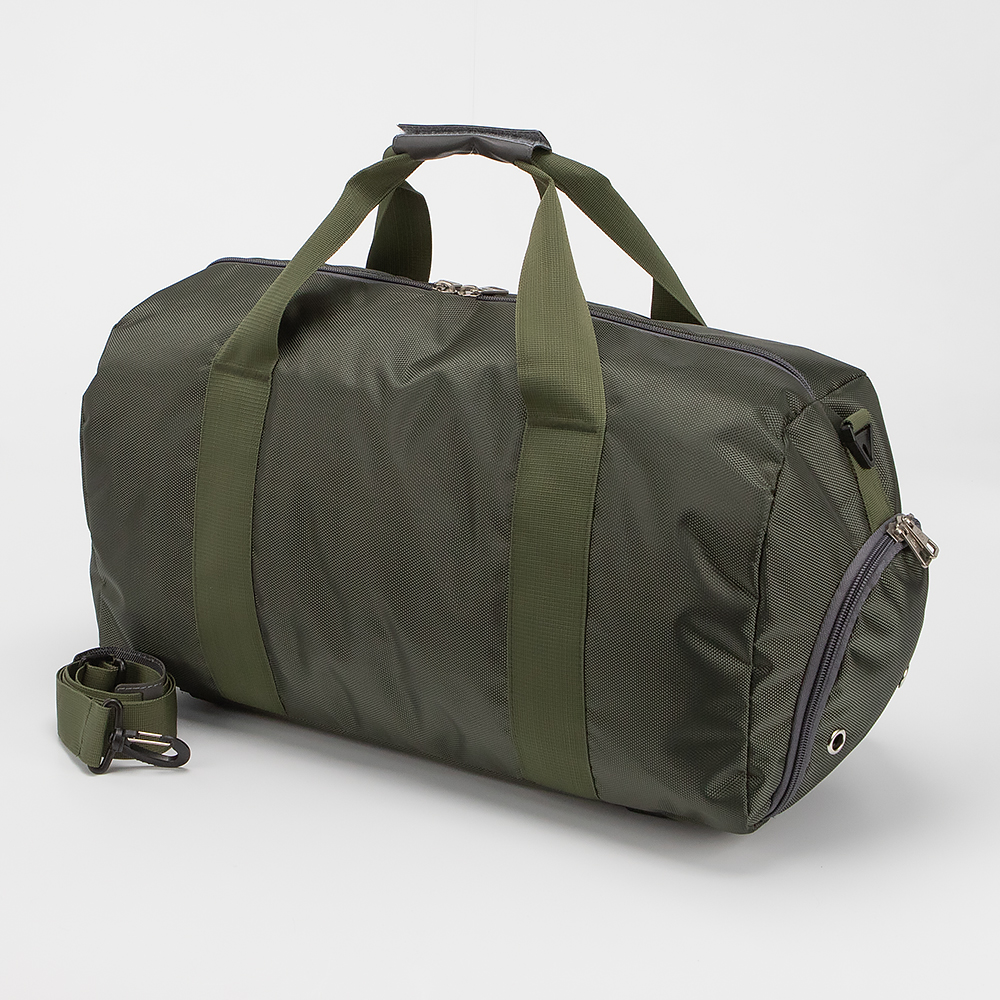 Дорожно-спортивная сумка от торговой марки Ecotope выполнена из плотного текстильного материала зеленого цвета. Модель с двумя ручками с фиксатором на липучке и съемным регулируемым плечевым ремнем. Отделение на молнии. Внутри: текстильная подкладка. Сбоку - карман для обуви. На лицевой стороне - карман на молнии.