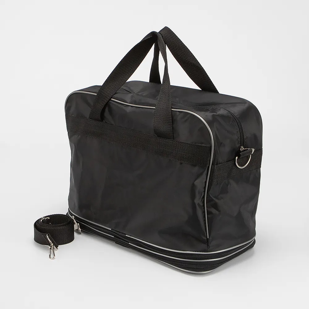 Дорожно-спортивная сумка от торговой марки Mr.Bag выполнена из плотного текстильного материала черного цвета. Модель с двумя ручками и съемным регулируемым плечевым ремнем. Отделение на молнии. Снизу имеется моолния для увеличения объема. С лицевой стороны - карман на молнии.