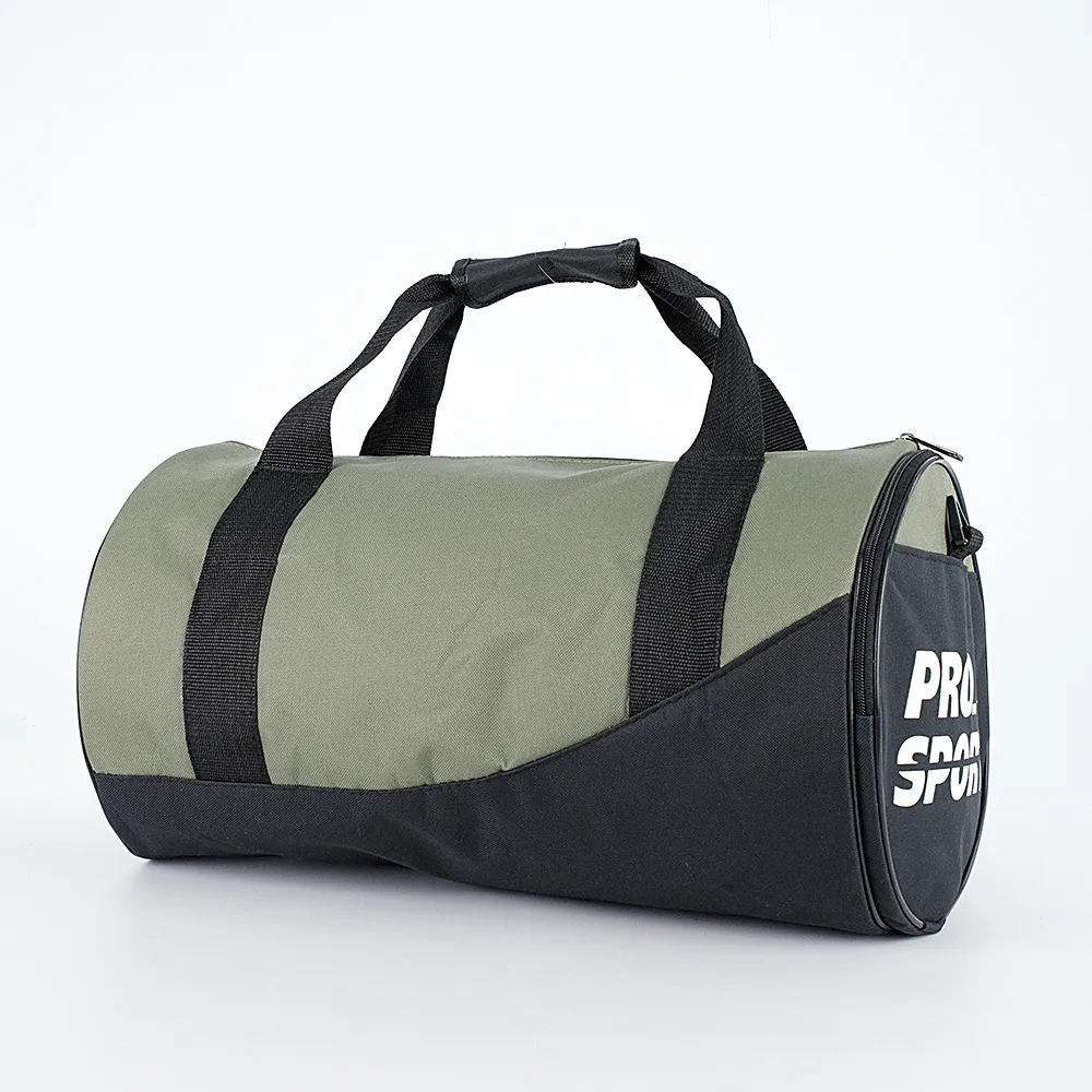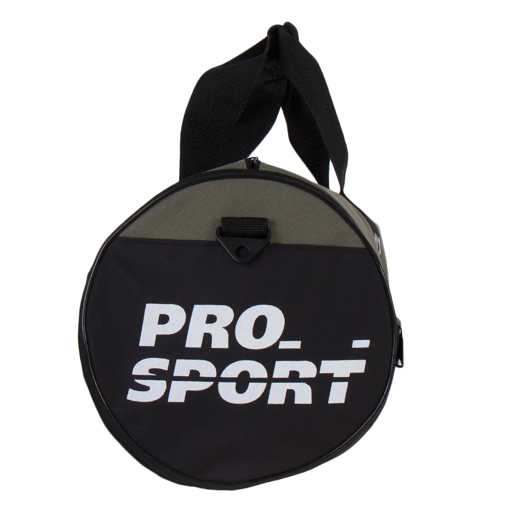 Спортивно-дорожная сумка от Mr.Bag выполнена из уплотненного текстильного материала цвета хаки с чёрными вставками и надписью «Pro sport». Модель в форме бочонка, с двумя удлиненными ручками и съемным плечевым ремнем. Отделение на молнии, с текстильной подкладкой. По бокам имеется по карману, с одной стороны – на молнии, с другой – карман-сетка.