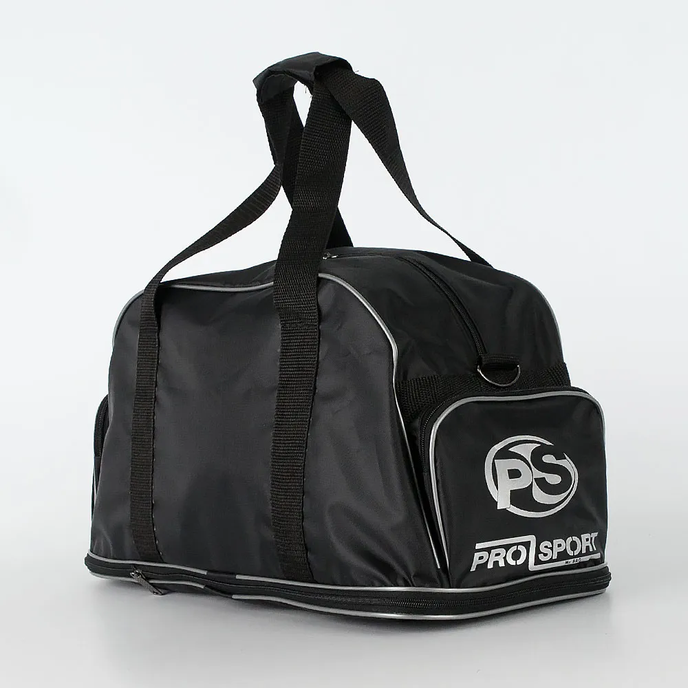 Спортивно-дорожная сумка от Mr.Bag выполнена из плотного текстильного материала черного цвета. Модель в форме купола, с двумя удлиненными ручками и съемным плечевым ремнем, с декоративной окантовкой. Отделение на молнии. По бокам – карманы на молнии. На передней стороне – накладной карман на молнии с прорезным карманом с внешней стороны и декоративная надпись «Pro sport» спереди и по бокам. В нижней части имеется раздвижка на молнии для увеличения объема сумки.