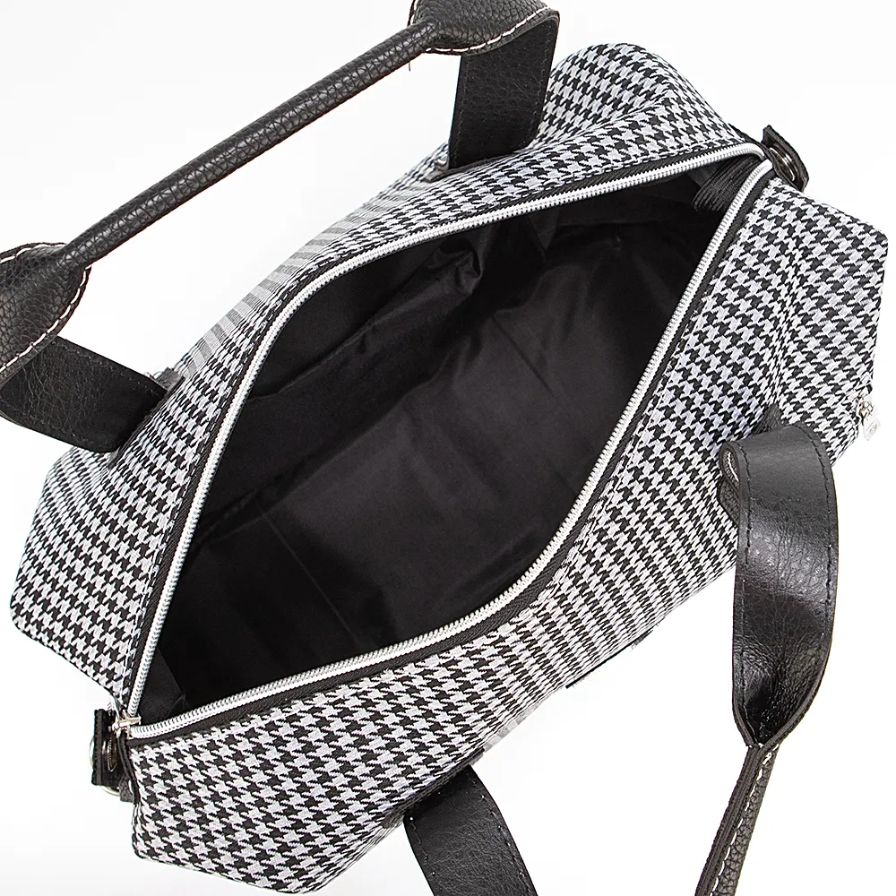 Дорожно-спортивная сумка от торговой марки Passo Avanti из искусственной кожи и текстильного материала черно-белого цвета с принтом «гусиная лапка». Модель с двумя ручками и съемным регулируемым плечевым ремнем. Отделение на молнии. Внутри: текстильная подкладка, накладной карман. На лицевой стороне и задней сторонах – карман на молнии. Дно оснащено металлическими ножками для защиты от износа.