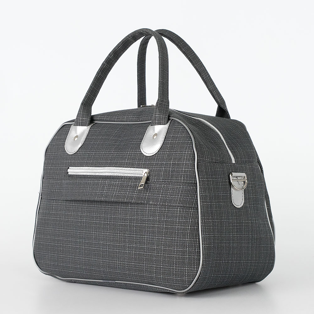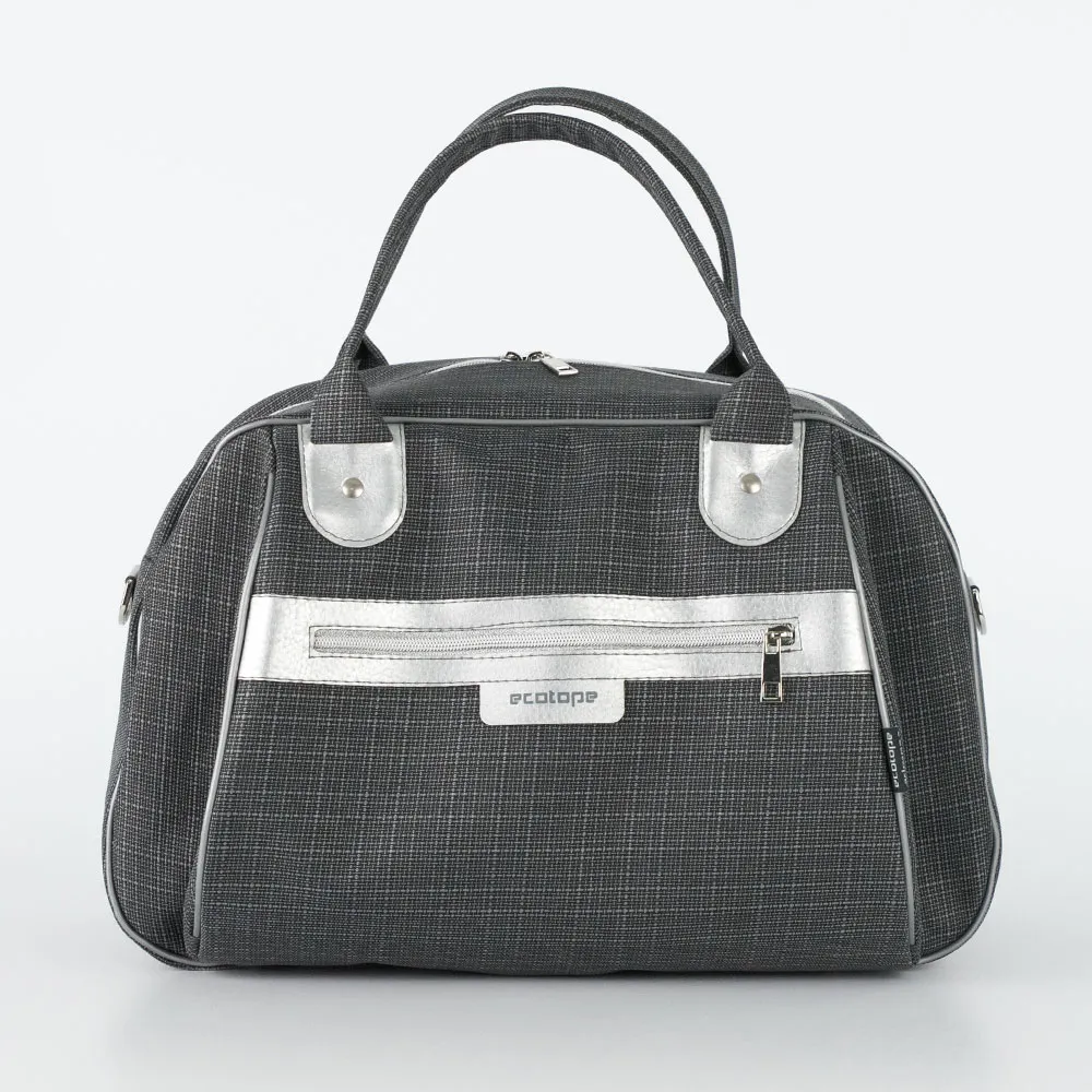 Вместительная дорожно-спортивная сумка от торговой марки Ecotope выполнена из прочного текстильного материала катионик серого цвета с вставками из искусственной кожи серебристо-серого цвета. Компактная модель с двумя плотными ручками, съемным регулируемым плечевым ремнем. Отделение на молнии. Внутри: навесной карман. На лицевой стороне – карман на молнии. На задней – карман на молнии, лямка для крепления на выдвижную ручку чемодана. Дно оснащено металлическими ножками для защиты от износа.