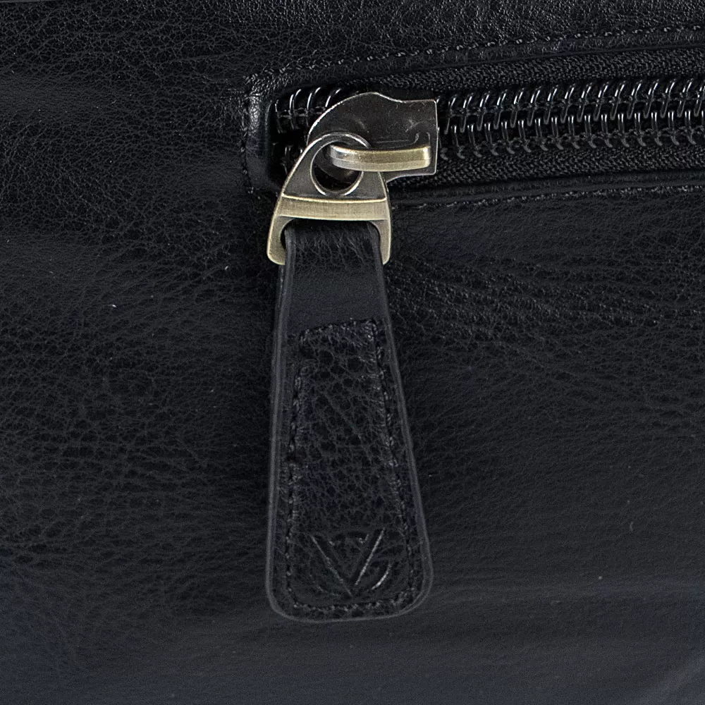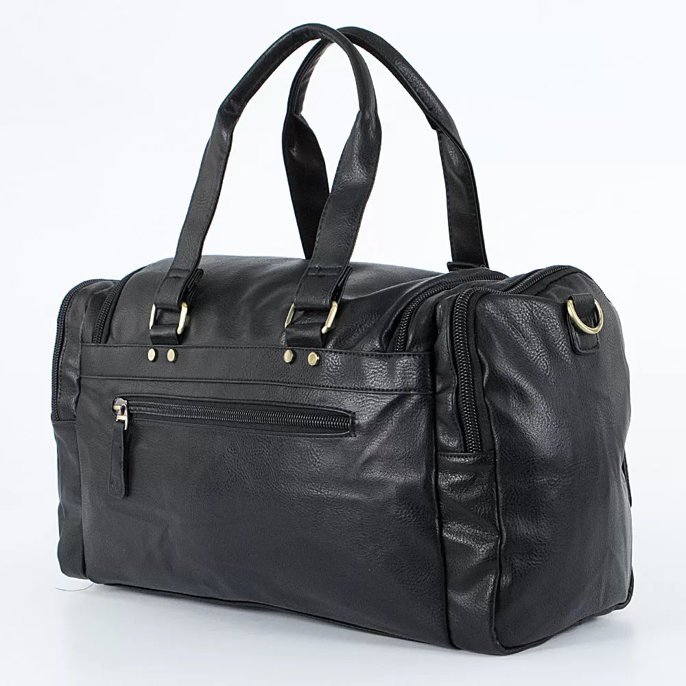 Дорожная сумка бренда Valigetti изготовлена из искусственной кожи черного цвета. Модель имеет две ручки и съемный регулируемый плечевой ремень. На лицевой стороне расположены два средних кармана быстрого доступа на молнии, а по бокам – еще два средних кармана на молнии. На спинке находится горизонтальный карман на молнии. Просторное основное отделение закрывается клапаном на молнии, внутри которого находится фирменная подкладка и потайной карман на молнии.