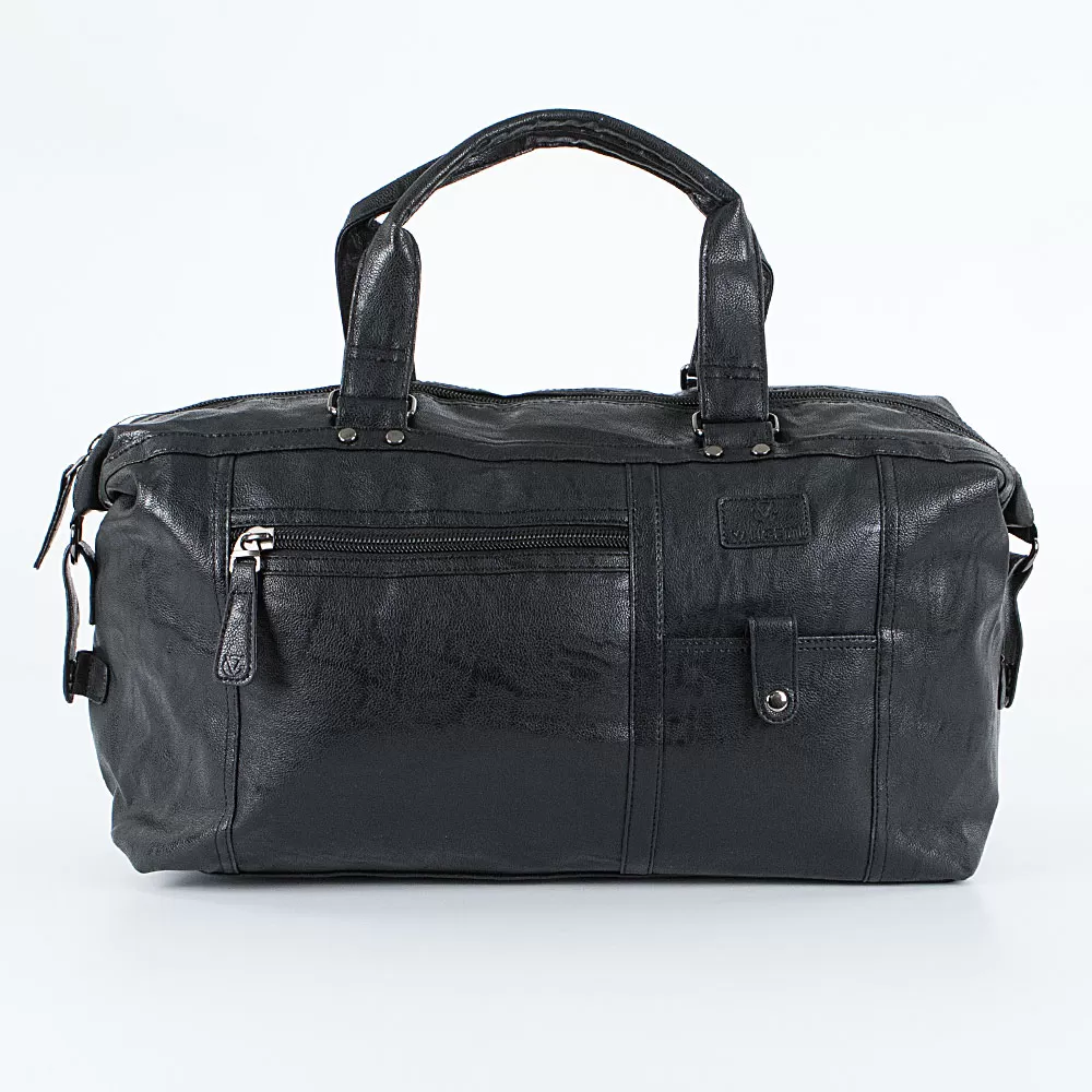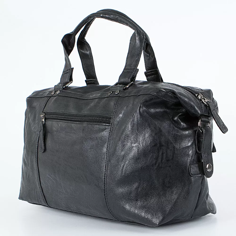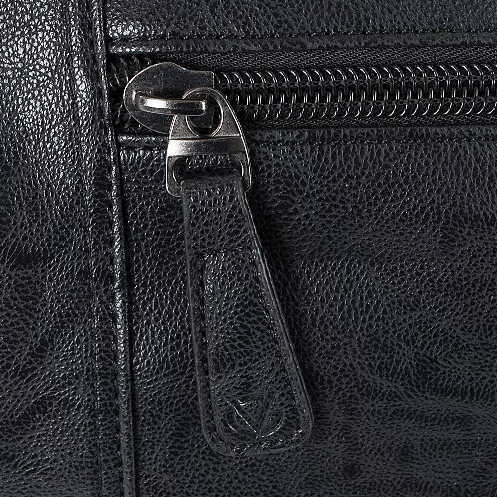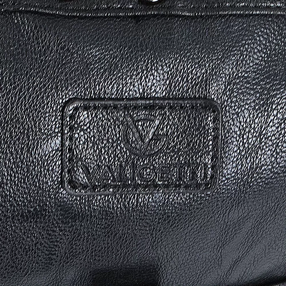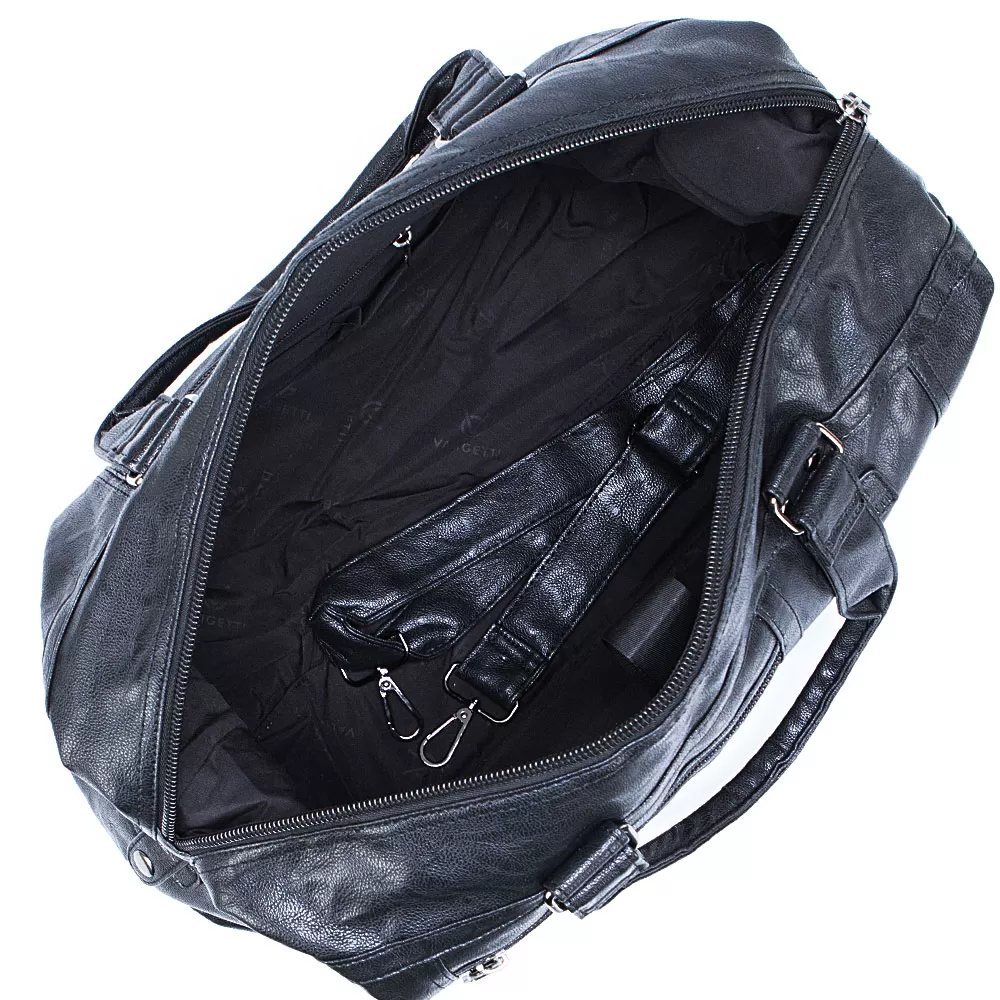 Дорожная сумка из искусственной кожи бренда Valigetti представлена в черном цвете. Модель оснащена ручками и съемным регулируемым плечевым ремнем. На лицевой стороне сумочки расположены два кармана быстрого доступа: вертикальный закрывается хлястиком на магнитной кнопке, а горизонтальный карман закрывается на молнию. По бокам сумочки есть два хлястика на кнопке, которые позволяют увеличить объем сумки при необходимости. На задней стороне расположен карман на молнии для быстрого доступа к мелочам. Сумочка имеет одно основное отделение, внутри которого находятся два накладных кармана, один потайной карман на молнии и отделение для планшета.
