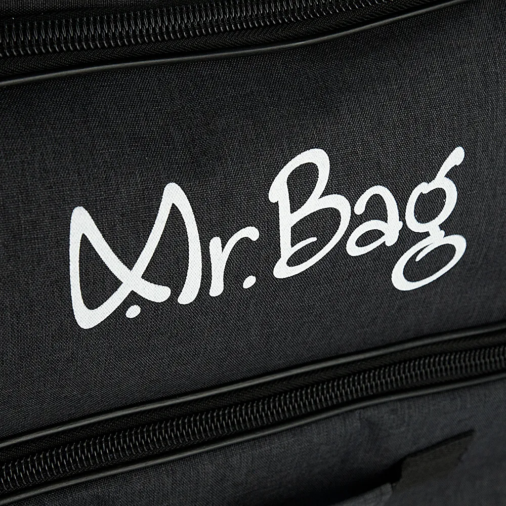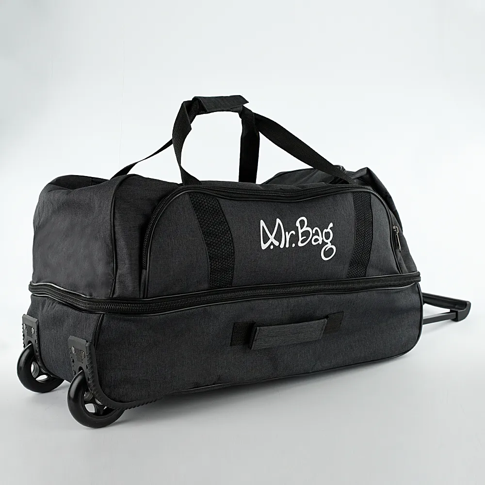 Дорожная сумка на колёсах от торговой марки Mr.Bag выполнена из практичного текстильного материала серого цвета с мягкой ромбовидной стежкой. Модель на двух колесах, для надежности утопленных в корпус, с выдвижной ручкой, двумя удлиненными ручками с фиксатором на липучке, двумя ручками по бокам и ручкой сверху. Закрывается клапаном на круговой молнии. Отделение без подкладки. На лицевой стороне – накладной карман на молнии, на задней – карман на молнии. Имеется раздвижка на молнии для увеличения объема. Дно сумки оснащено большой круглой пластиковой ножкой. Сумка весом 2,4 кг рассчитана на объем до 106,5 литров.