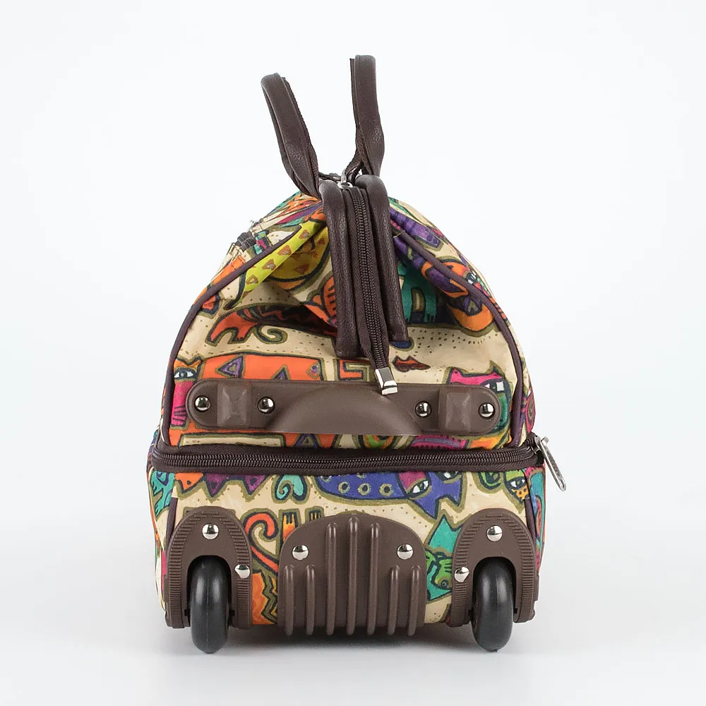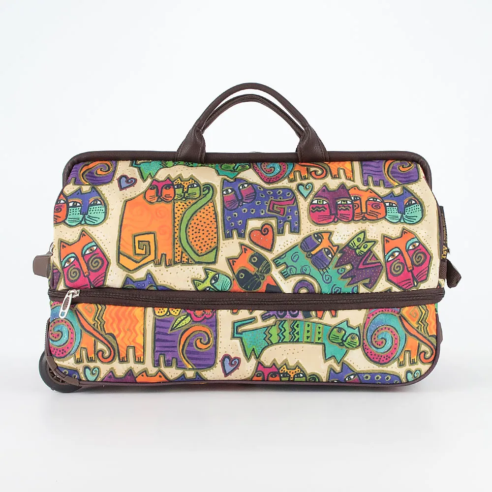 Большая дорожная сумка-саквояж на колёсах от торговой марки TSV выполнена из практичного полиэстера. Модель яркой расцветки с оригинальным изображением котов; на двух колёсах, утопленных в корпус. Имеется выдвижная ручка, две плотные ручки, ножки с держателем, круглая пластиковая ножка на дне. Отделение на рамочном замке, на молнии. Внутри: текстильная подкладка, карман на молнии. На задней стороне – карман на молнии. Объем сумки увеличивается с помощью раздвижки на молнии.