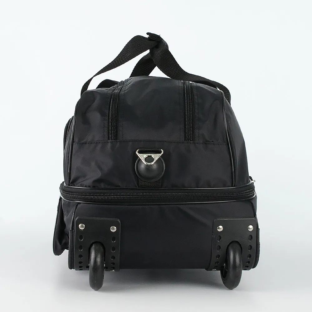 Дорожная сумка на колёсах от торговой марки Mr.Bag выполнена из плотного и практичного текстильного материала синего цвета. Сумка оснащена двумя колёсами, которые для надёжности утоплены в корпус, выдвижной ручкой, двумя ручками с фиксатором на липучке, съемным регулируемым плечевым ремнем, ручкой-переноской, пластиковыми ножками на дне и сбоку. Вместительное отделение закрывается двумя молниями. Внутри: без подкладки. На лицевой стороне – два кармана на молнии. Имеется раздвижка на молнии для увеличения объёма. Сумка весом 990 грамм рассчитана на объем 57,6 литров.