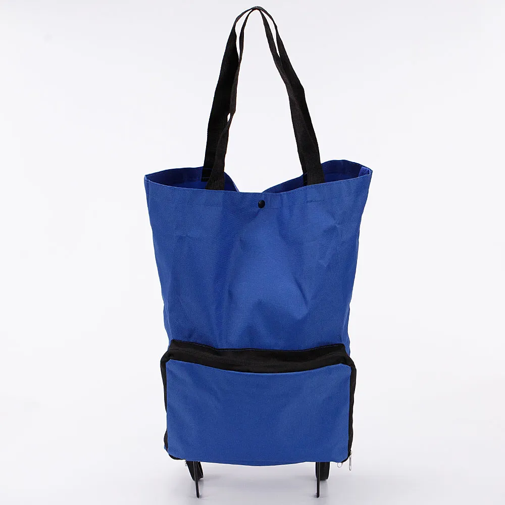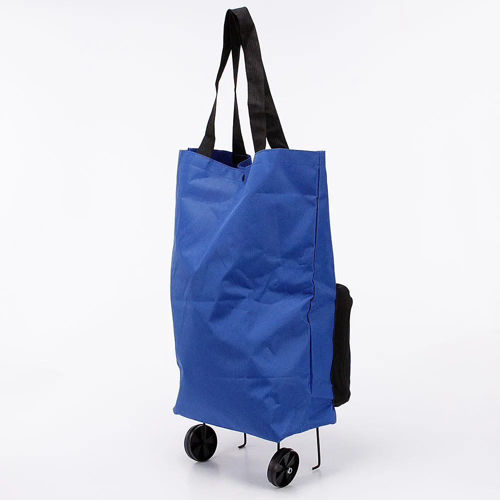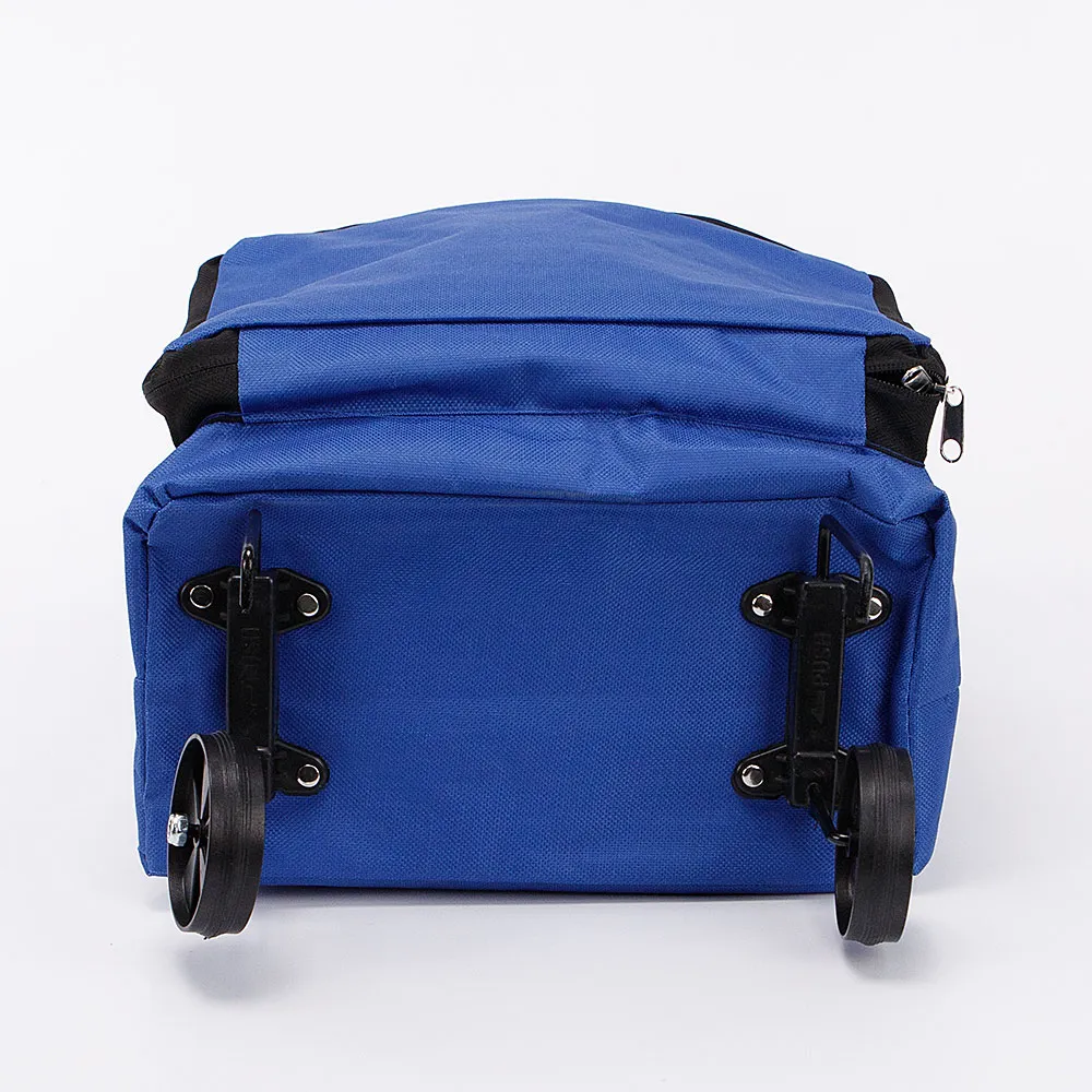 Складная хозяйственная сумка на колесах из текстильного материала синего цвета. Компактная модель на двух складных колесах, с двумя удлиненными ручками. Глубокое отделение фиксируется кнопкой. Внутри: без подкладки. На лицевой стороне – карман на молнии.