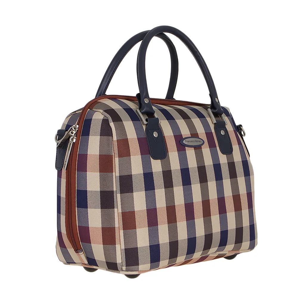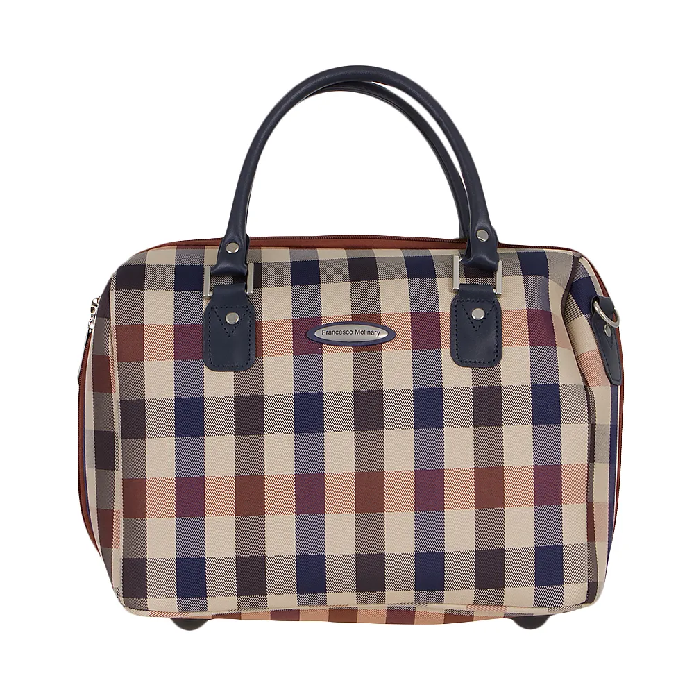 Дорожная сумка от торговой марки Francesco Molinary из плотного текстильного материала синего цвета в красно-белую клетку и искусственной кожи. Модель с двумя ручками и съемным регулируемым плечевым ремнем с наплечником. Отделение на молнии с двумя бегунками, оснащенными «ушками» для навесного замка, не входящего в комплект. Внутри: фирменная подкладка, карман на молнии, накладные карманы. На задней стороне – лямка для крепления на выдвижную ручку чемодана. Дно оснащено пластиковыми ножками для защиты от износа.
