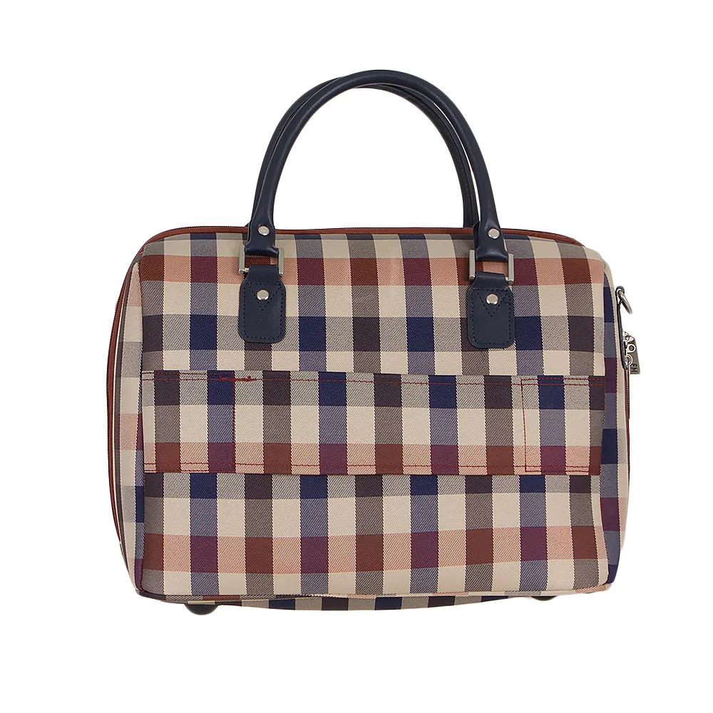 Дорожная сумка от торговой марки Francesco Molinary из плотного текстильного материала синего цвета в красно-белую клетку и искусственной кожи. Модель с двумя ручками и съемным регулируемым плечевым ремнем с наплечником. Отделение на молнии с двумя бегунками, оснащенными «ушками» для навесного замка, не входящего в комплект. Внутри: фирменная подкладка, карман на молнии, накладные карманы. На задней стороне – лямка для крепления на выдвижную ручку чемодана. Дно оснащено пластиковыми ножками для защиты от износа.
