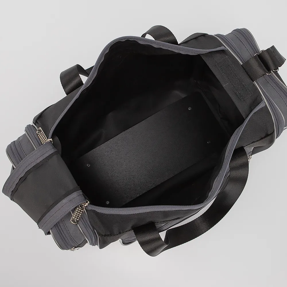 Дорожно-спортивная сумка от торговой марки Mr.Bag из практичного текстильного материала. Модель с двумя ручками, регулируемым плечевым ремнем. Отделение закрывается клапаном с двумя молниями. Внутри: без подкладки. На лицевой стороне, декорированной принтом, – карман на молнии. По бокам имеется карман на молнии. Дно оснащено пластиковыми ножками для защиты от износа.