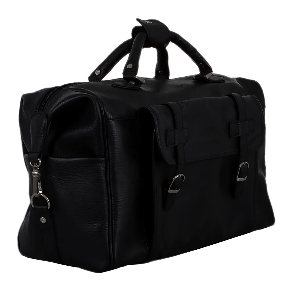 Большая дорожная сумка Francesco Molinary из натуральной кожи черного цвета. Модель с одним отделением на молнии, внутри также есть небольшой прорезной карман на молнии. Снаружи: накладной карман закрывается на откидной клапан на магнитах, декорированный двумя ремнями с серебристыми пряжками. По бокам сумки есть накладные карманы. В комплекте съемный регулируемый плечевой ремень из текстиля и кожи. На дне небольшие металлические «ножки» защищающие от износа.