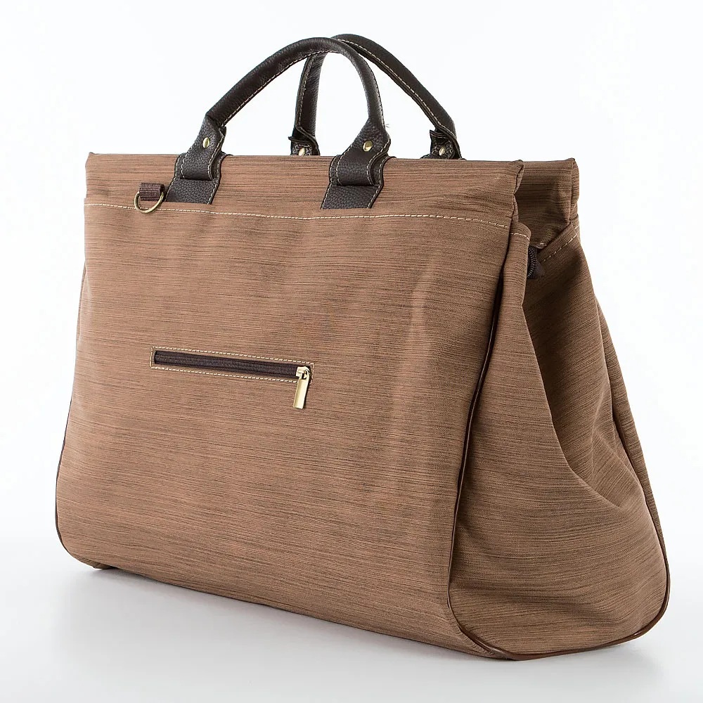 Дорожно-спортивная сумка от торговой марки Ecotope из текстильного материала и искусственной кожи в светло-коричневом меланжевом цвете. Модель с двумя ручками и съемным плечевым ремнем. Отделение на молнии. Внутри: текстильная подкладка, два накладных кармана, перекрестные багажные ремни с застежкой фастекс. На лицевой и задней сторонах – карман на молнии. Дно оснащено металлическими ножками для защиты от износа.