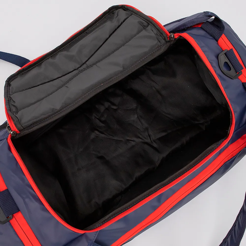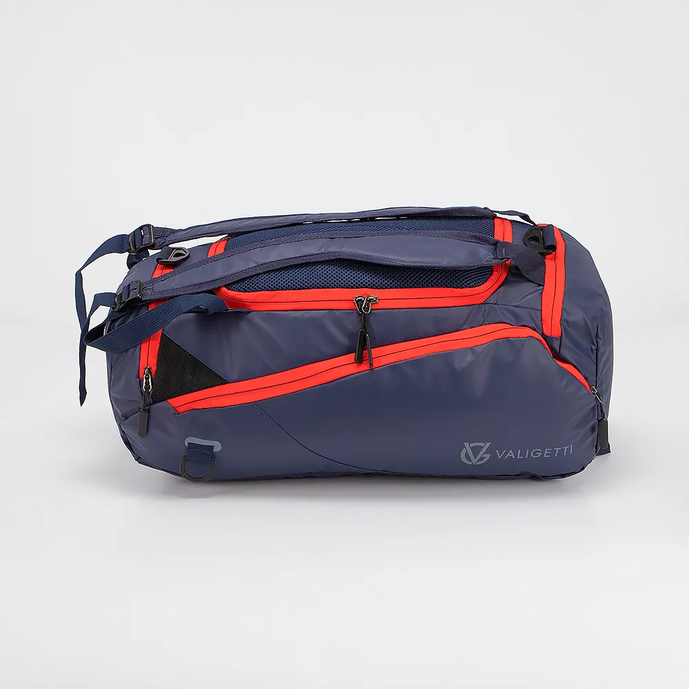 Сумка-рюкзак от торговой марки Valigetti выполнен из практичного текстильного материала синего цвета с оранжевыми элементами. Модель с лямкой для переноски, длинным регулируемым плечевым ремнем с наплечником и регулируемыми плечевыми ремнями. Закрывается клапаном на молнии. По бокам - карманы на молнии, на задней стороне - карман-сетка. Спереди - фигурный карман на молнии.