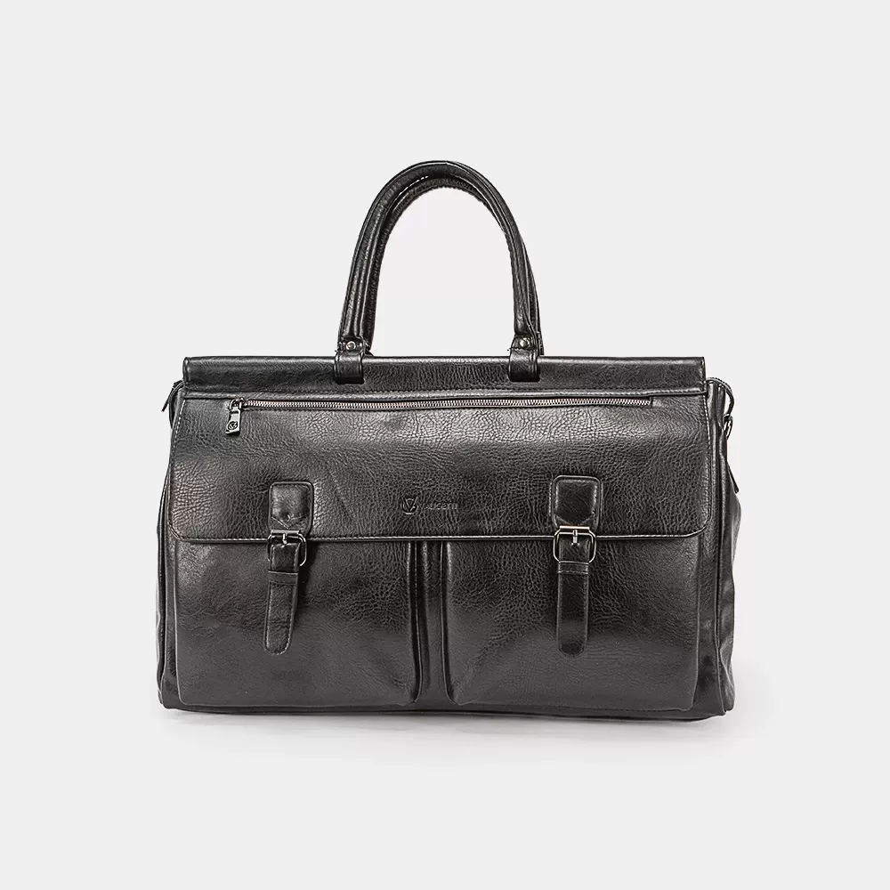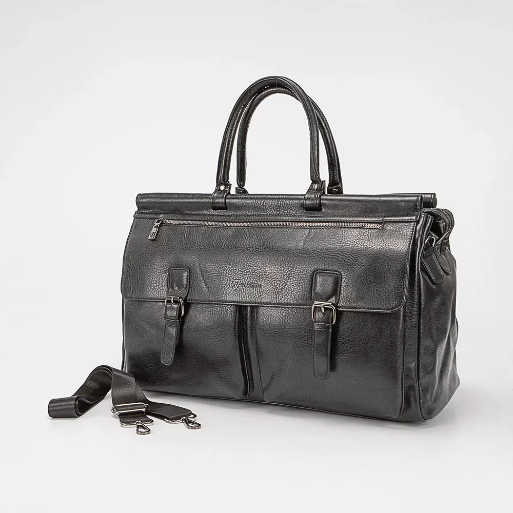 Дорожная сумка от известного бренда Valigetti выполнена из искусственной кожи черного цвета. Модель оснащена двумя удлиненными ручками и регулируемым съемным плечевым ремнем из текстиля.