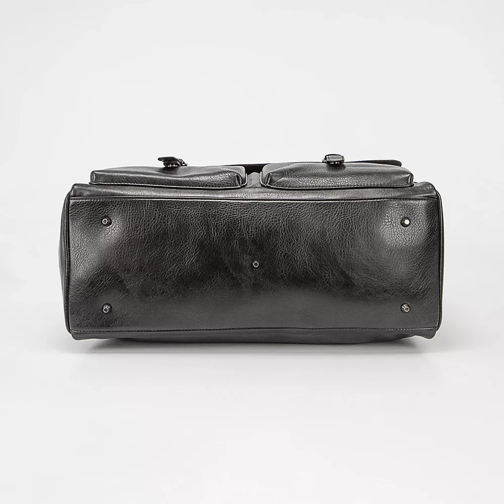 На лицевой стороне расположены два накладных кармана, которые закрываются клапаном с декоративными ремешками. На задней стороне сумки расположен еще один карман на молнии. Дно сумки оснащено металлическими ножками, что обеспечивает защиту от износа.