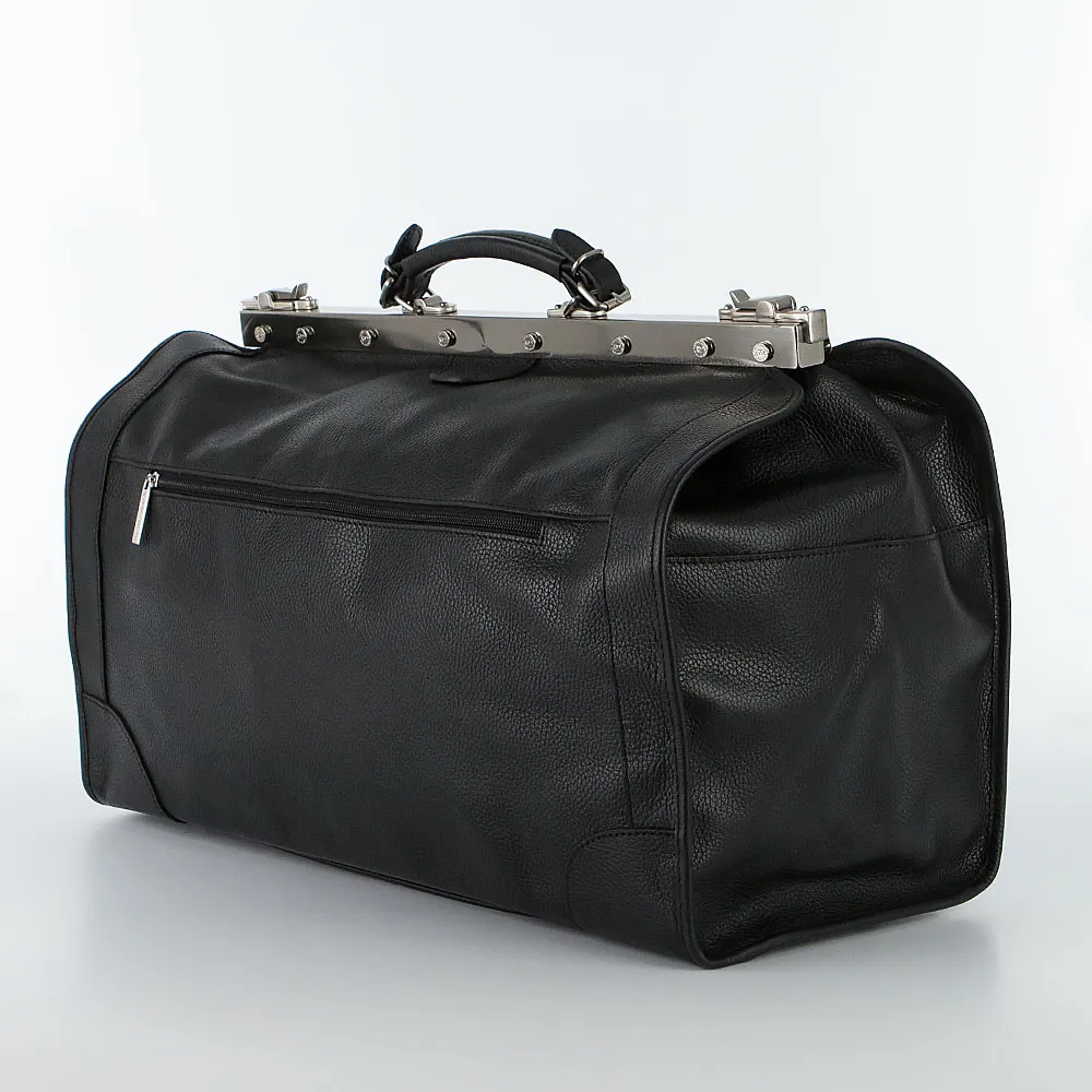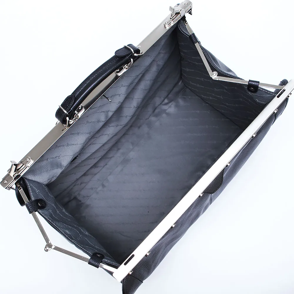 Вместительный саквояж от торговой марки Francesco Molinary из натуральной кожи черного цвета с фирменной металлической фурнитурой. Модель с плотной ручкой, с надежным рамочным замком, благодаря которому обеспечивается комфортный доступ внутрь. Внутри: фирменная подкладка, два кармана на молнии. На задней стороне – карман на молнии. Саквояж подчеркнет вкус и статус своего владельца.