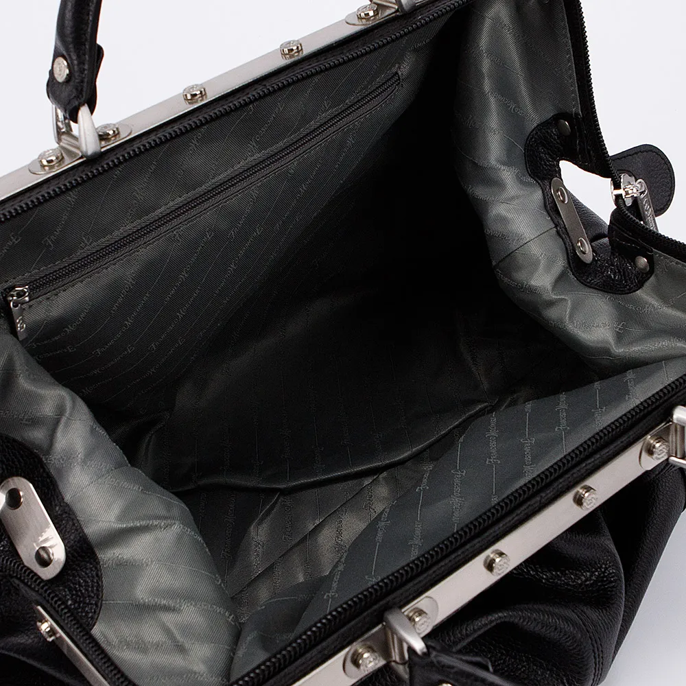 Саквояж от торговой марки Francesco Molinary выполнена из натуральной кожи коричневого цвета. Модель с двумя плотными ручками. Имеет рамочный тип открытия, что обеспечивает удобный доступ. Отделение на молнии с двумя встречными бегунками. Внутри: фирменная подкладка, карман на молнии. На задней стороне – карман на молнии. Дно оснащено ножками для защиты от износа.