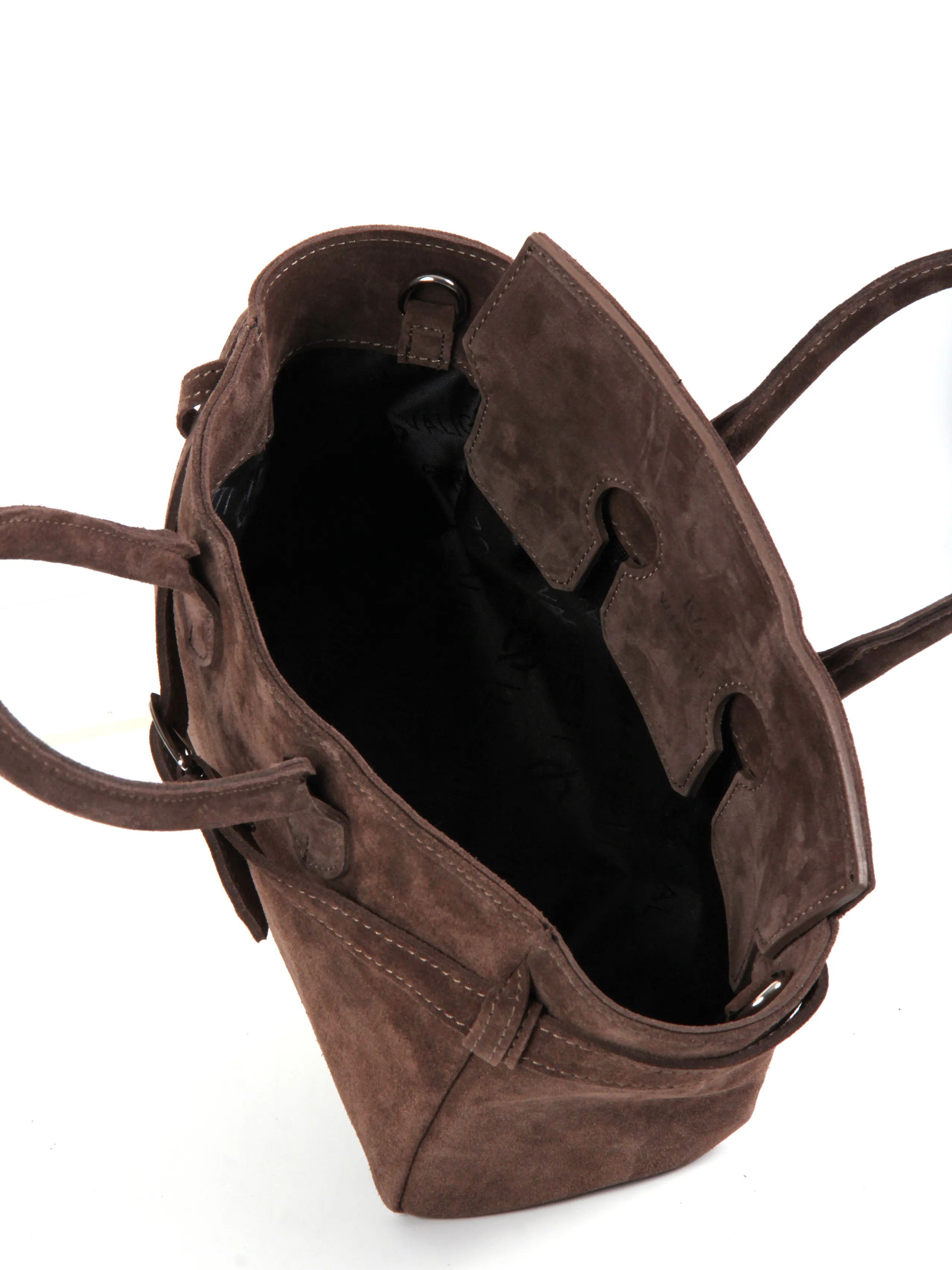 Сумка от бренда Valigetti выполнена из натуральной замши в коричневом цвете. Модель с двумя ручками и съемным регулируемым плечевым ремнем. Внутри фирменный текстильный подклад, накладной открытый карман и боковой карман на молнии. Дно оснащено металлическими ножками для защиты от износа.