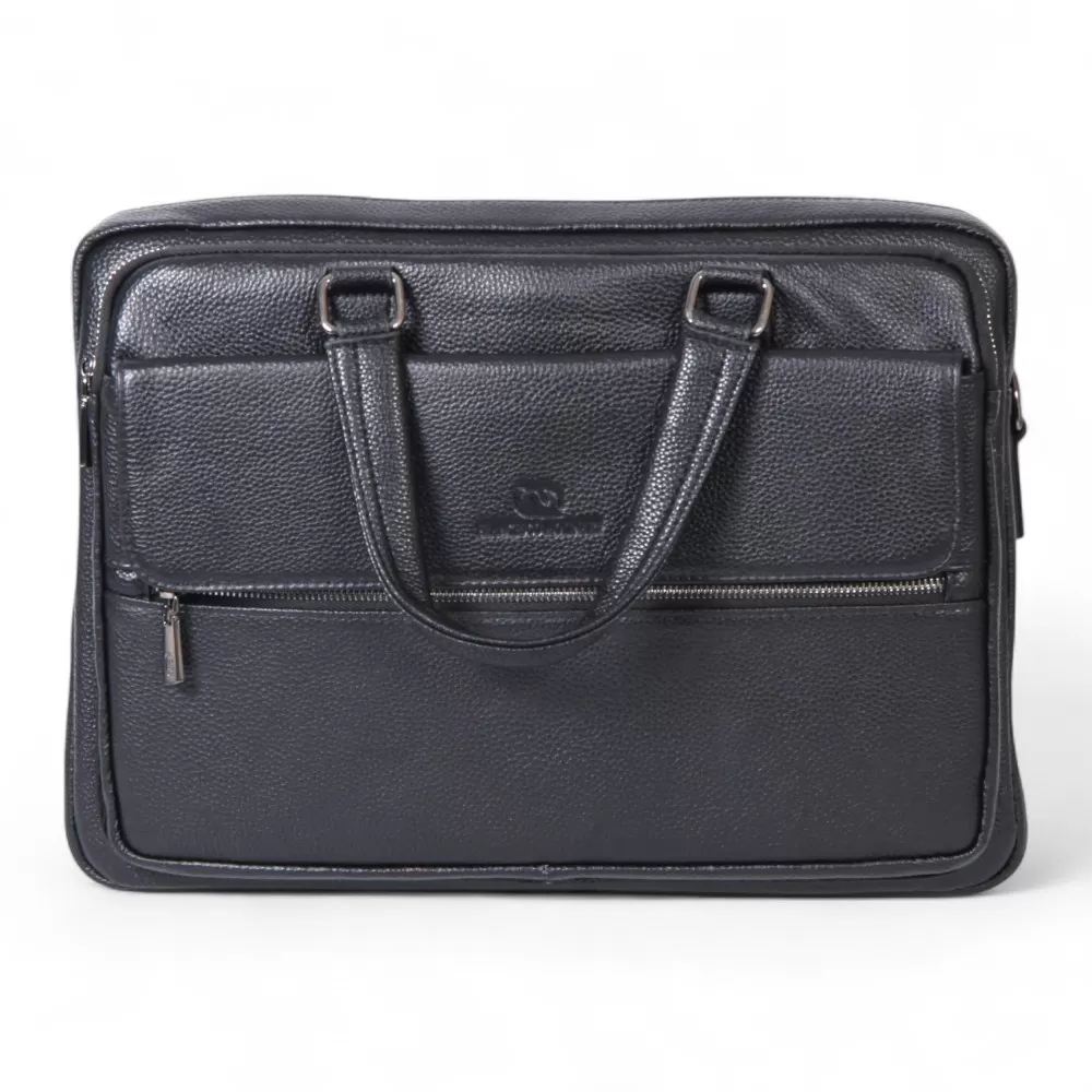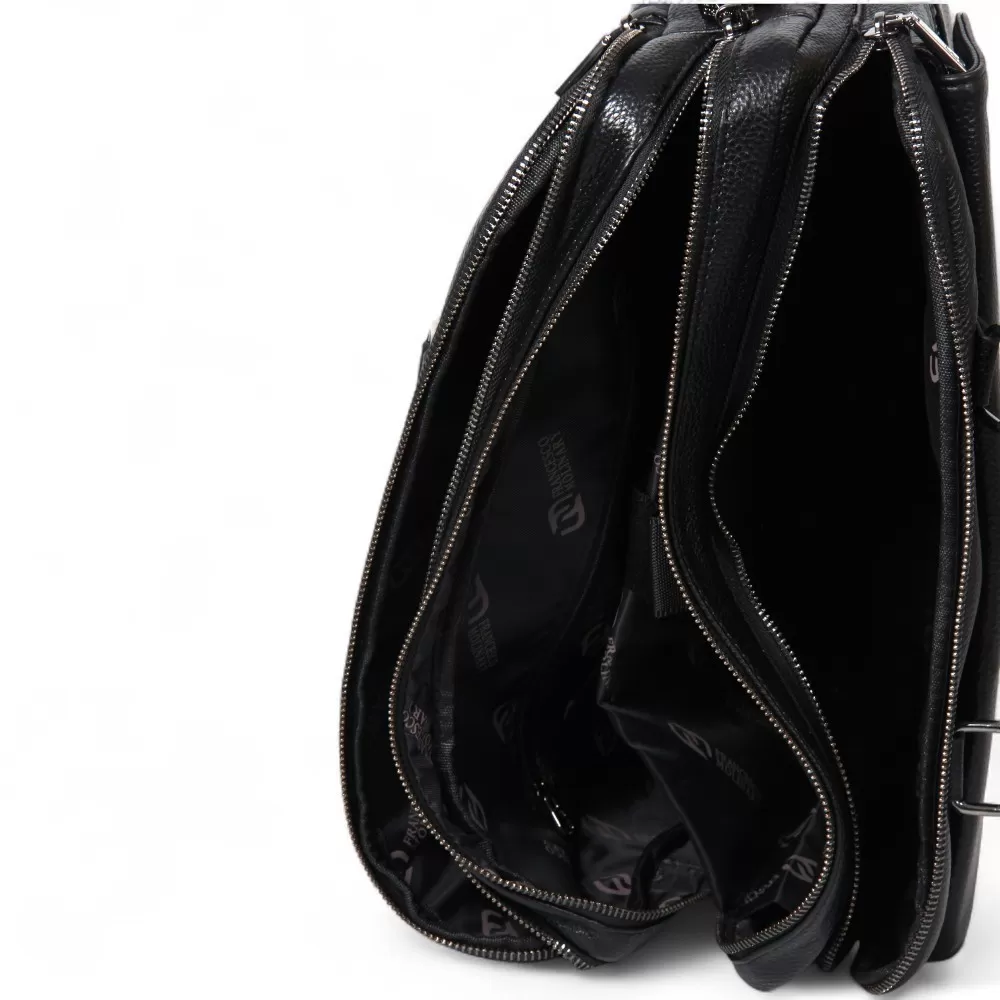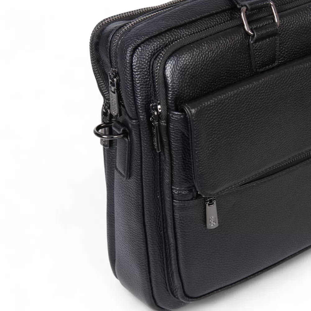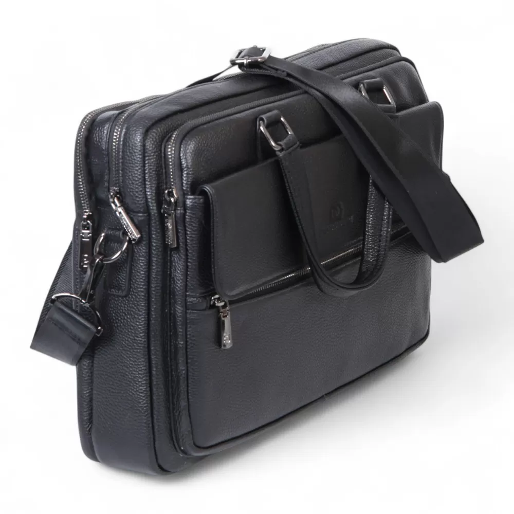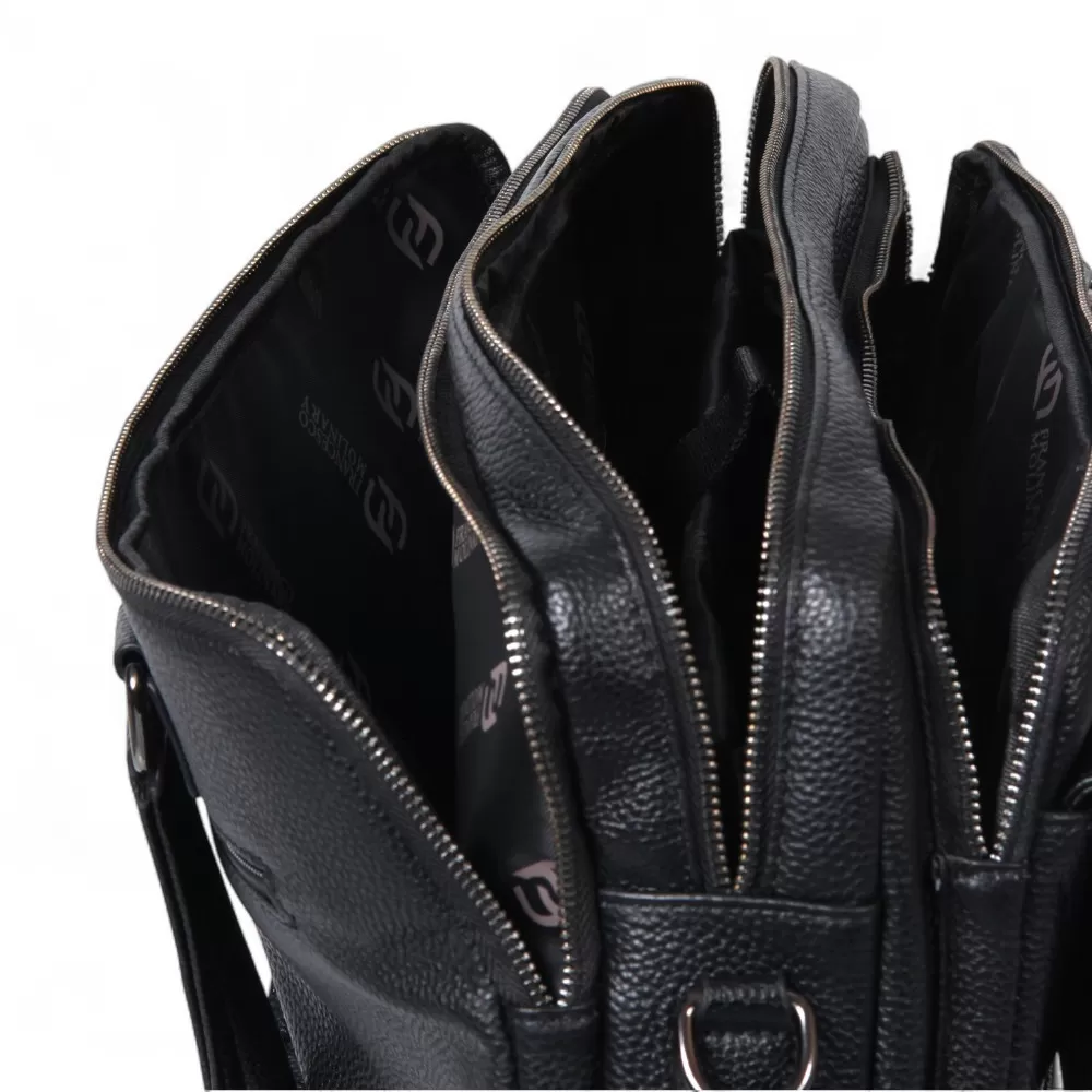 Сумка от Francesco Molinary изготовлена из черной натуральной кожи. Модель оснащена двумя ручками и съемным плечевым ремнем с регулировкой длины. Внутри два отделения на молнии. Внутри: фирменная подкладка, накладной карман с уплотненными стенками, два накладных кармана и карман на молнии. Снаружи — вместительный накладной карман с клапаном и карман на молнии сзади.